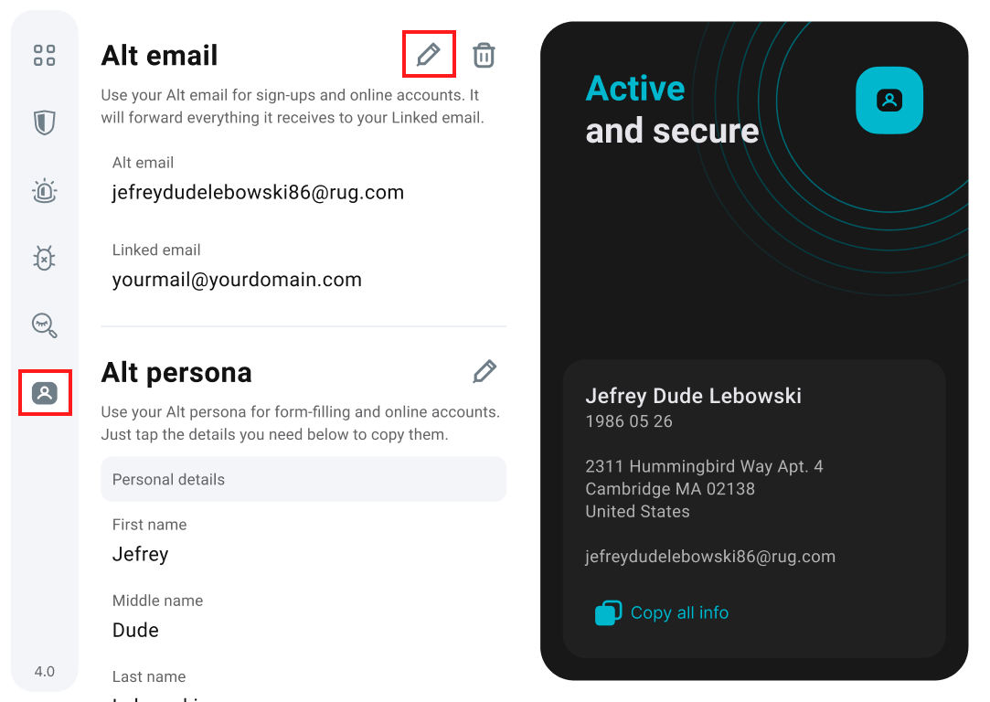 1. Open the Surfshark browser extension,  click on the Alternative ID tab, and click on the pencil icon next to the Alt persona.