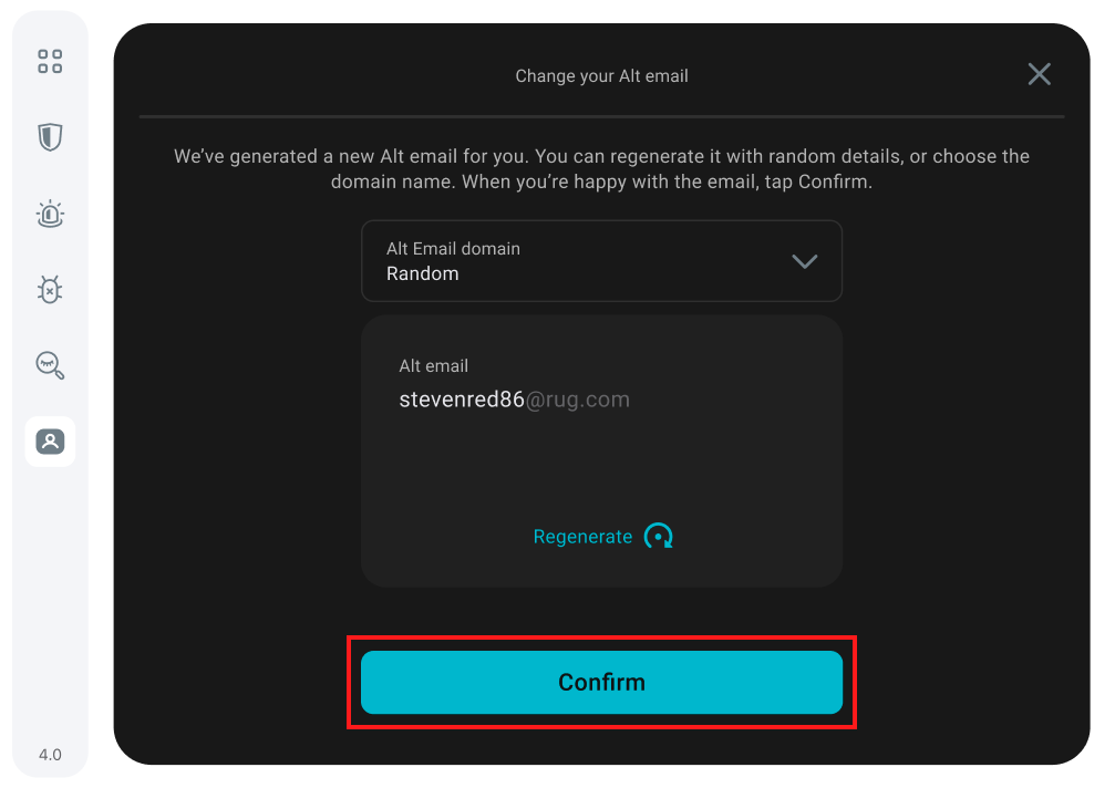 2. In the next window, you will be introduced to your alternative email. You can either keep the generated one or regenerate a different one. Once you are happy with your Alt email, click Confirm.