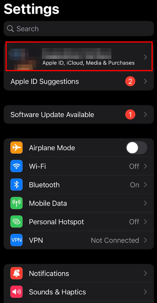 - Open the Settings on your iOS device, and click on your name at the top of the page.