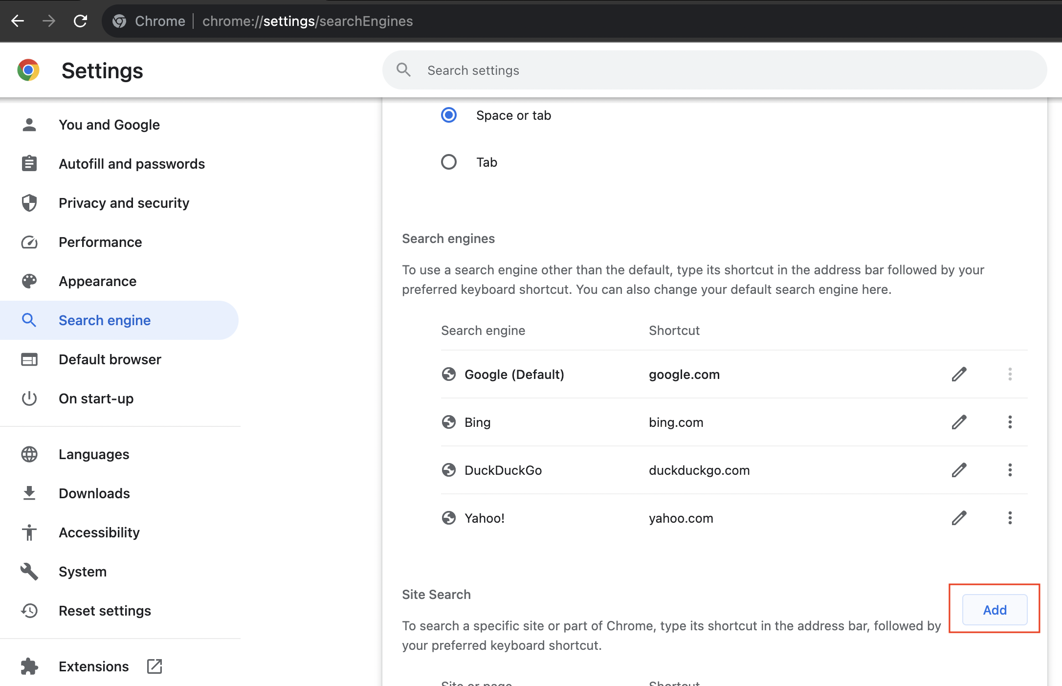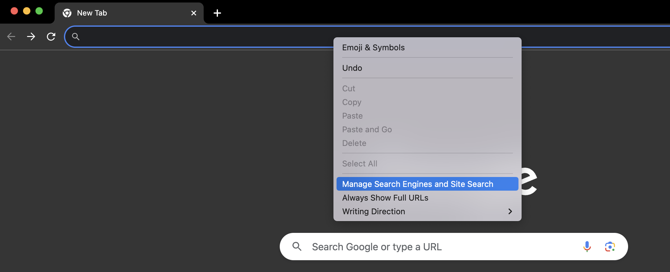 - Right-click in the address bar, and select Manage search engines and Site Search.