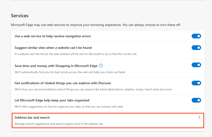 - In the list that appears, scroll down and look for Services. There, click on Address bar and search.