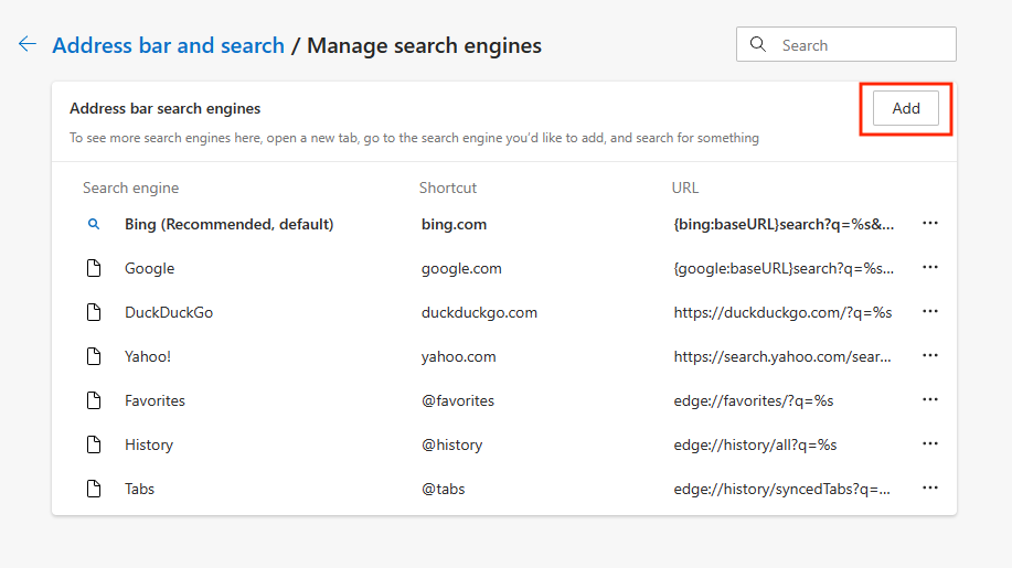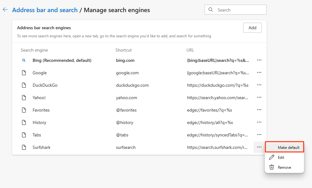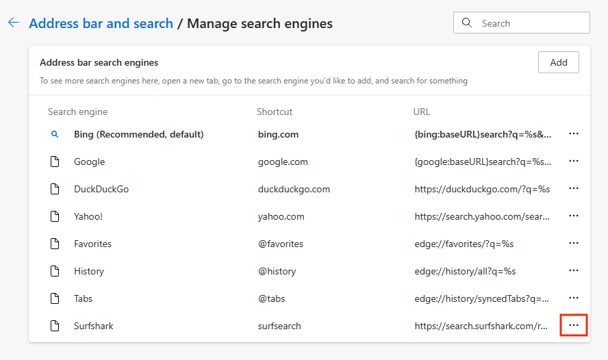 Once done, click on Add again. - Now, click the three dots next to the Surfshark Search listing.