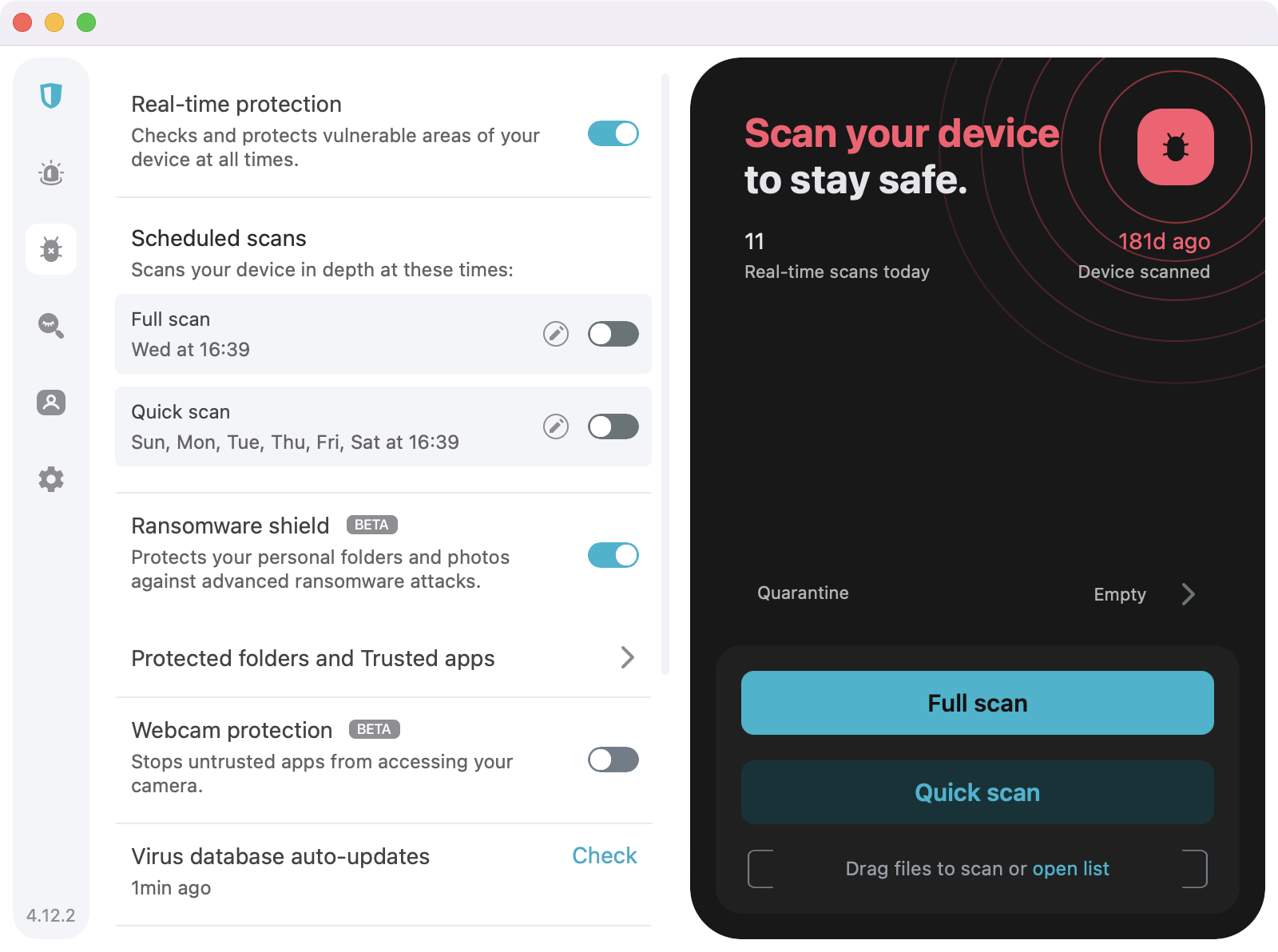 - Scheduled scans – schedule an automatic Full or Quick scan for certain days at a specific time.