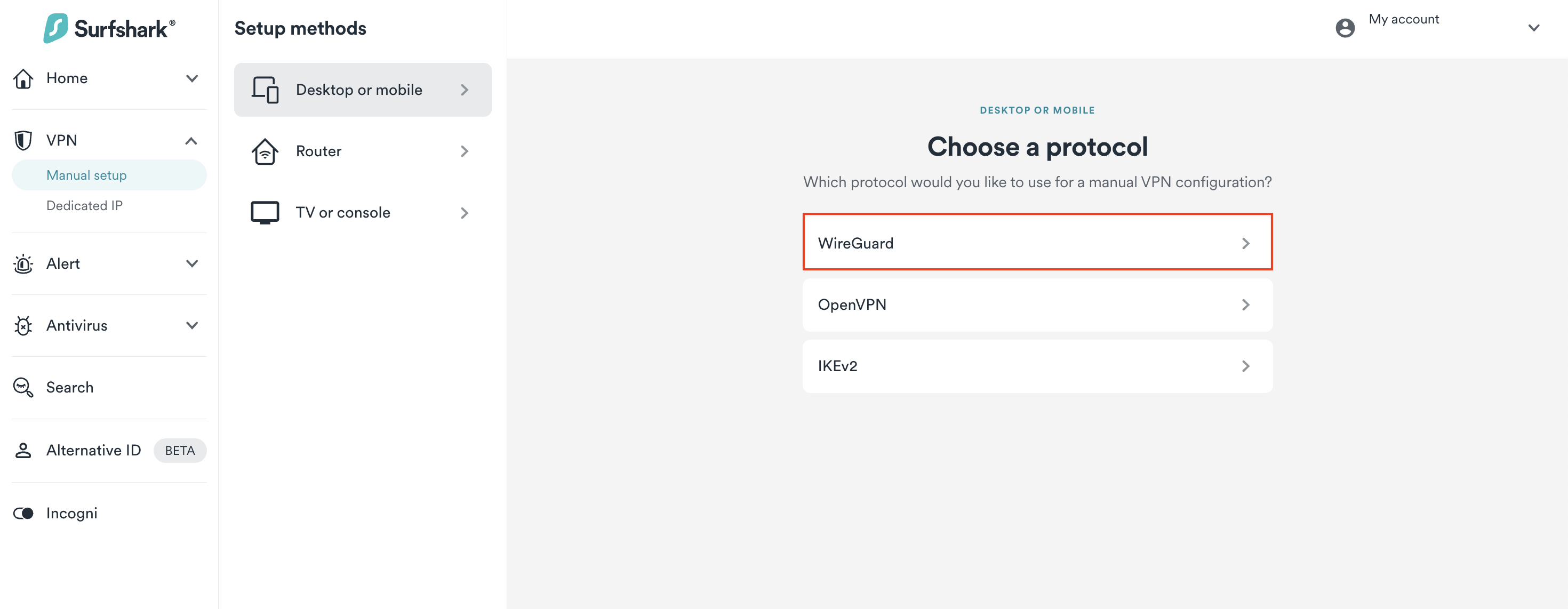 - Enter the Surfshark login page and log in. Then, click on VPN > Manual Setup > Desktop or mobile > WireGuard to navigate to the Credentials tab.