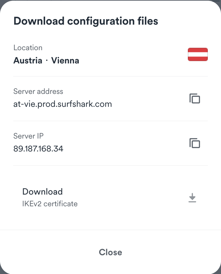 - Here, you will find the server IP, server address, and the ability to download the IKEv2 certificate.