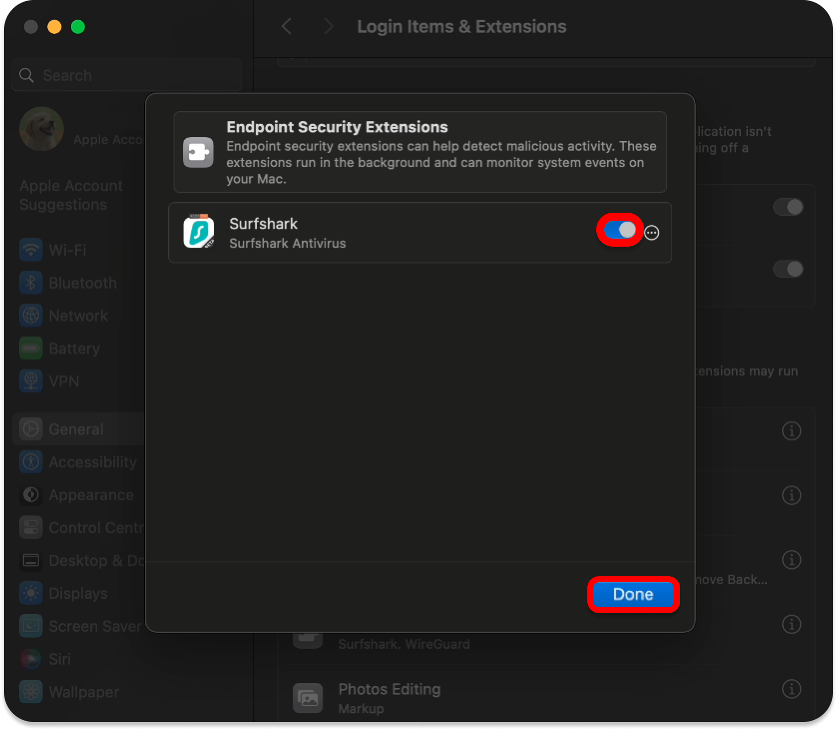 - Select Endpoint Security Extensions and make sure that Surfshark is toggled ON. Once you do, press Done.