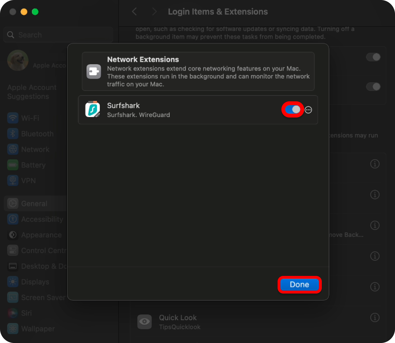 - Make sure that Surfshark is toggled ON. Afterward, press Done.