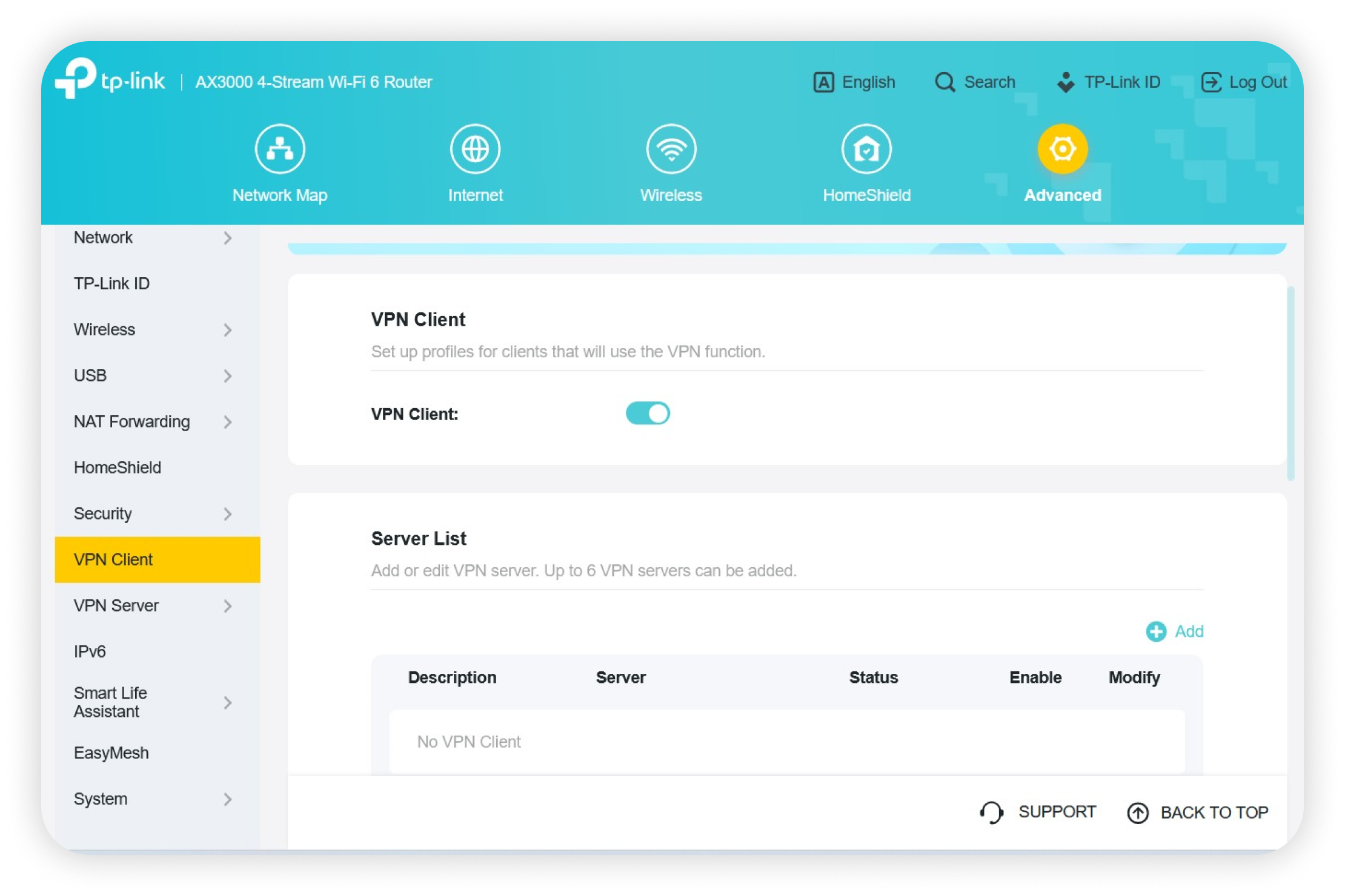 2. Turn to advance, select VPN Client, and enable the option VPN Client: