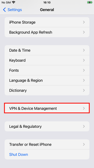 Open the Settings app on your device, go to General, and tap on the VPN & Device Management tab.