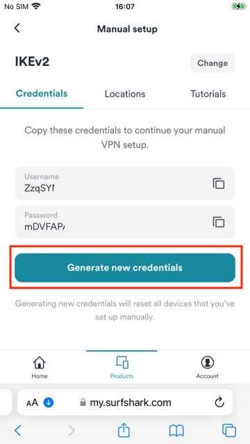 Enter the Surfshark login page and log in. Then, click on Products > VPN > Manual Setup > Desktop or mobile > IKEv2 to generate your credentials.