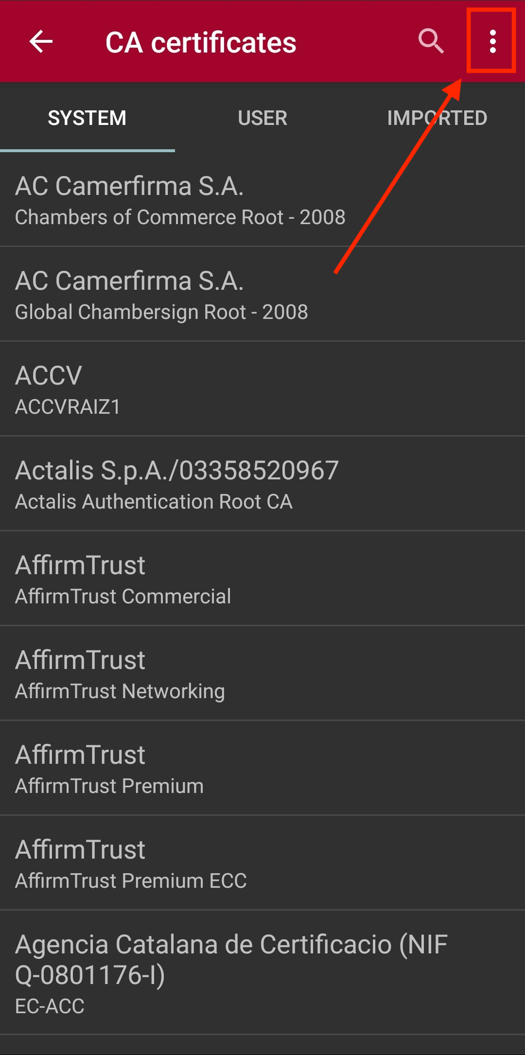 4. A certificate list will appear. Tap on the three vertical dots again.