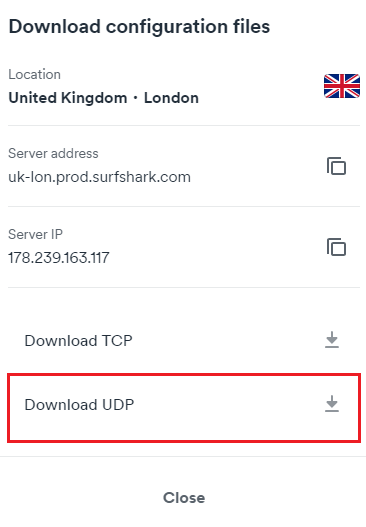 - Click on the download icon to the right of the server name and click on Download UDP.