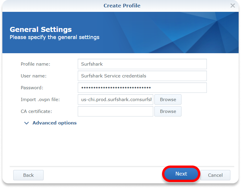 Password: Surfshark service password (refer to Get your credentials section in this article)