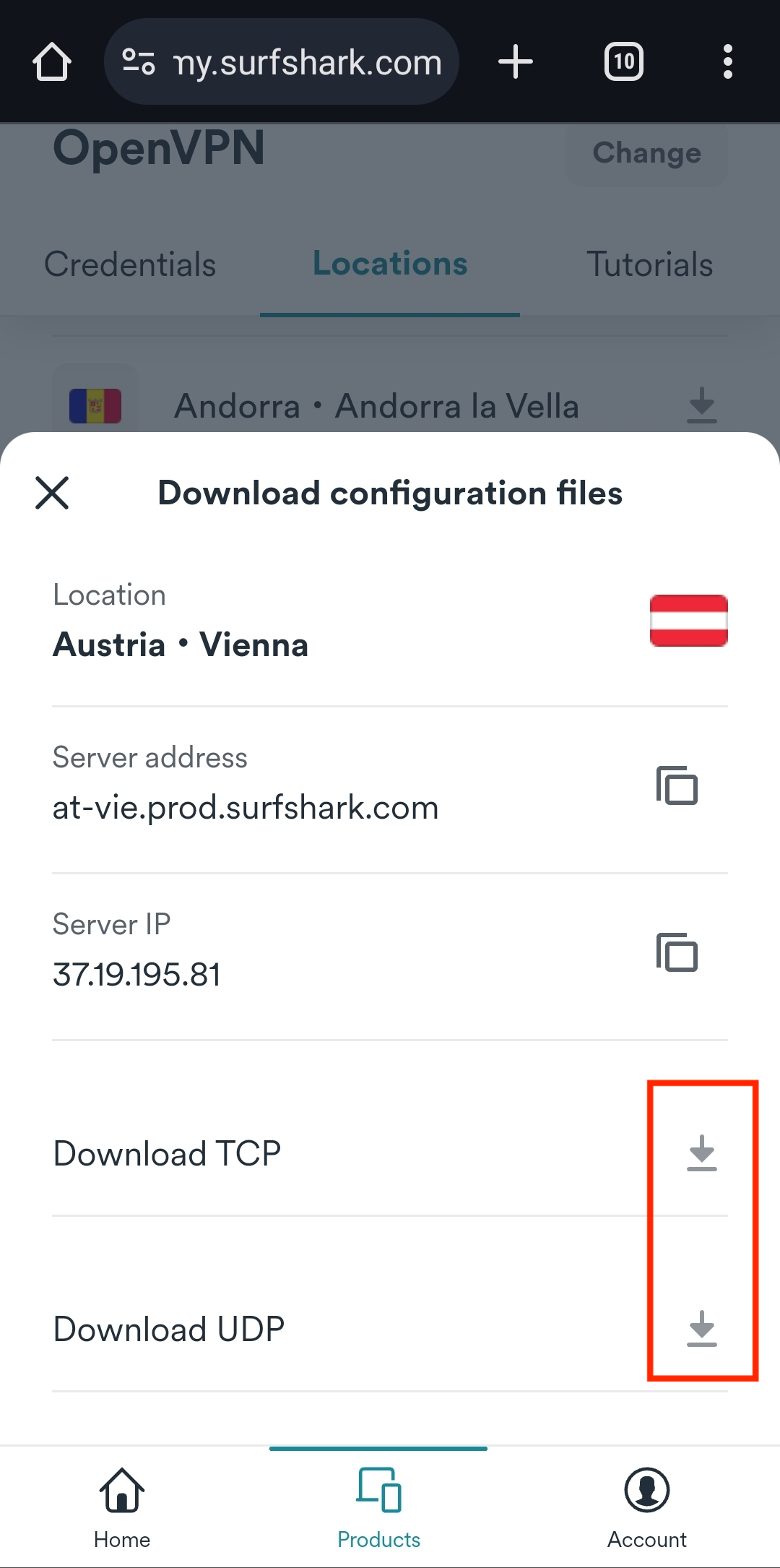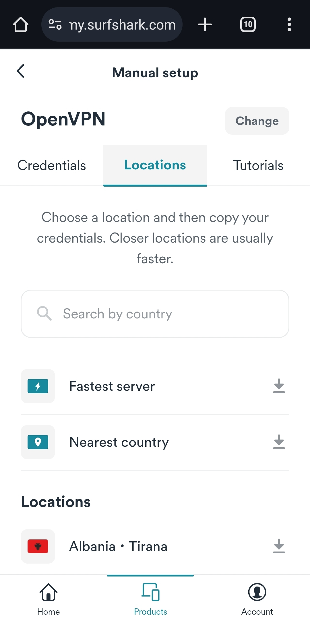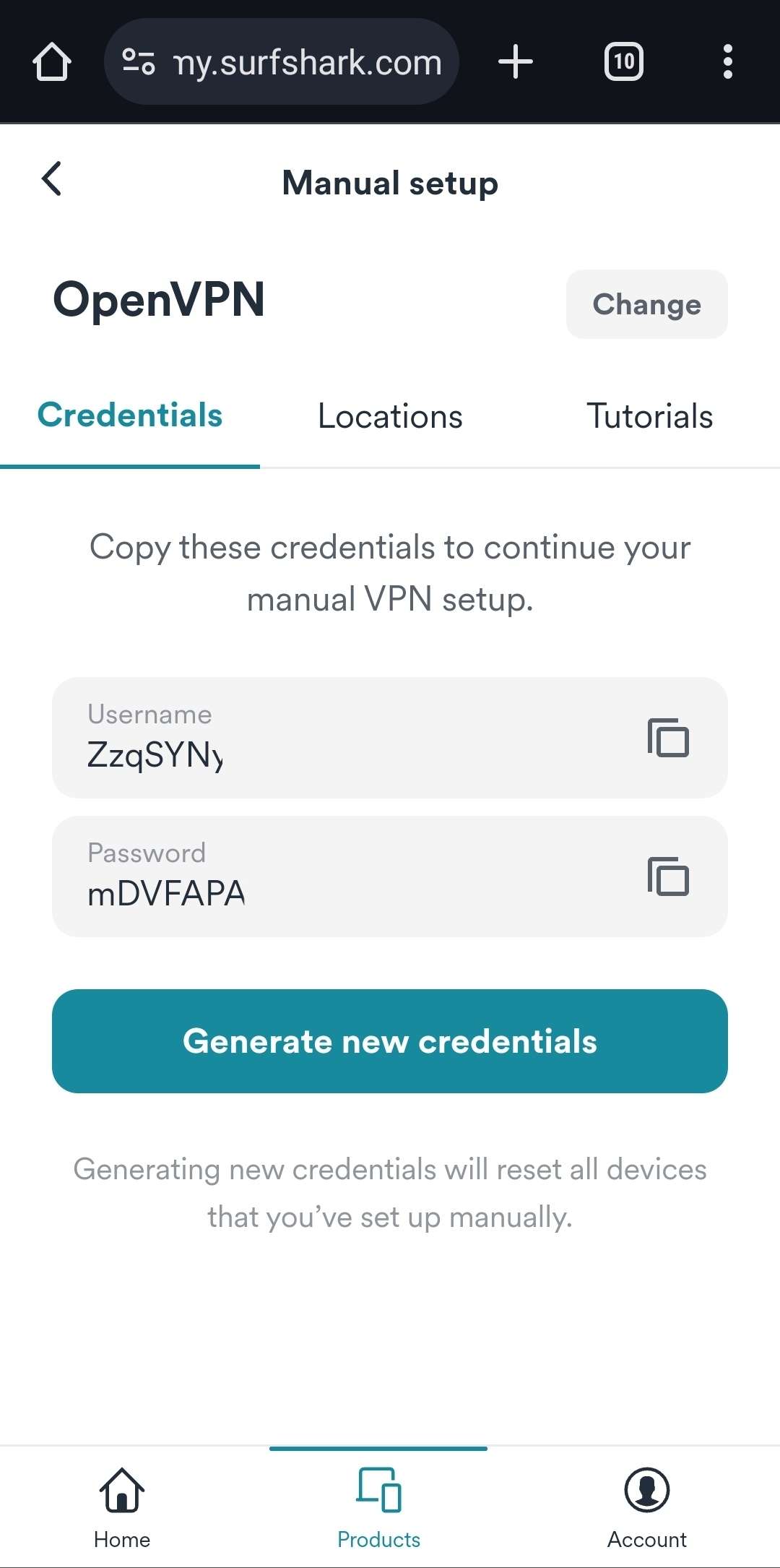 - Go to the Surfshark login page and log in. Tap on Products > VPN > Manual setup > Desktop or mobile > OpenVPN