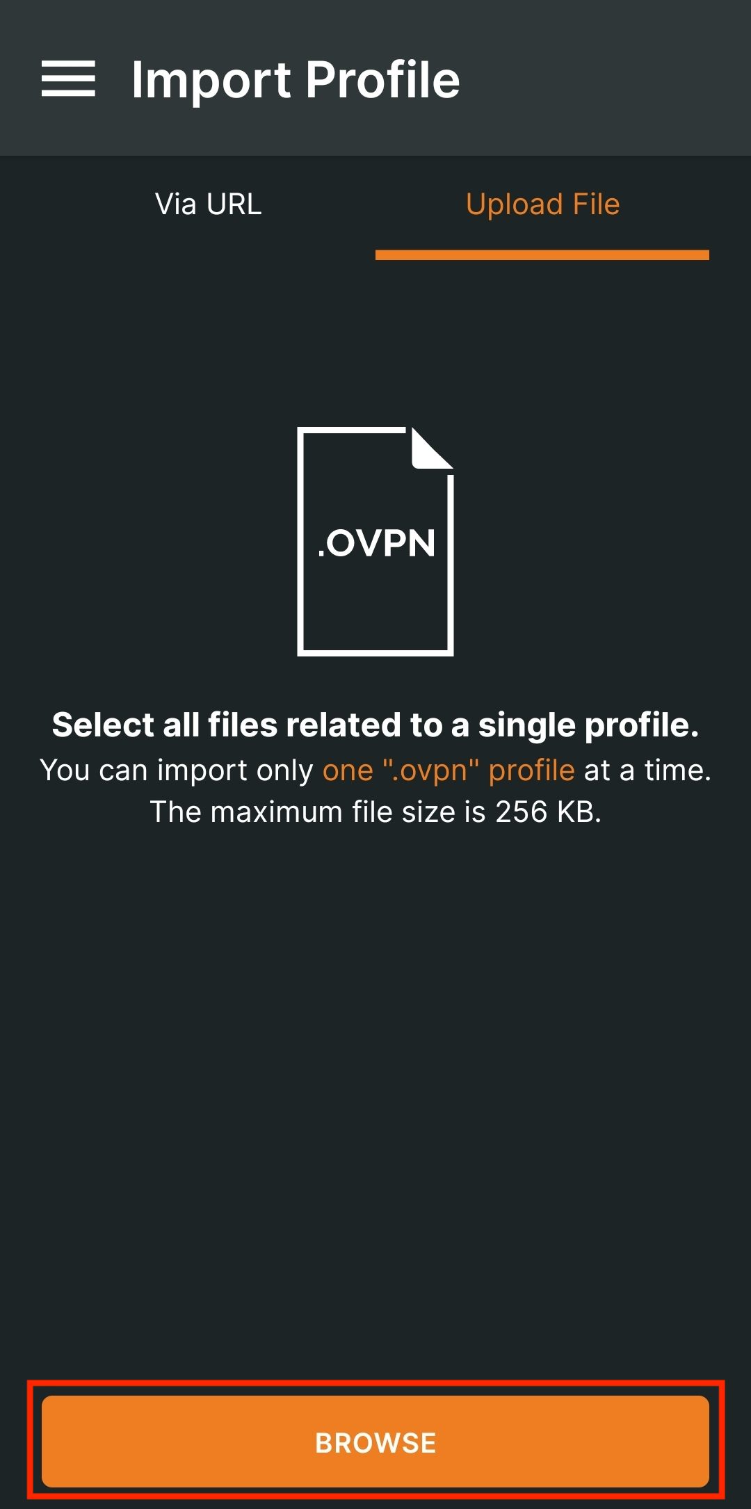 - You need to upload your configuration file (refer to the Download configuration filesin this article). To do so, switch to the UPLOAD FILE tab and tap on BROWSE.