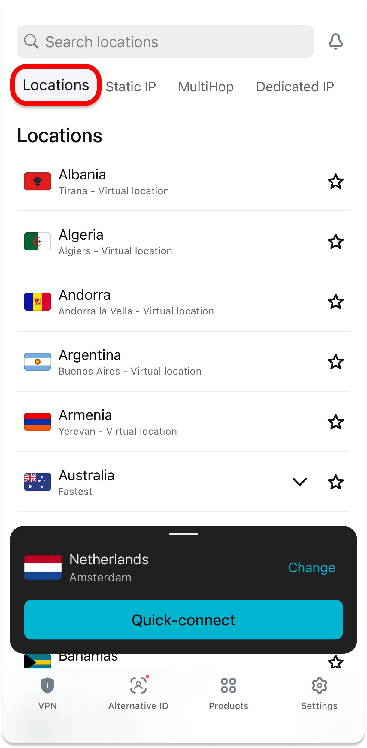 To manually choose a server, go to the locations tab. You will find the full list of Surfshark locations. Tap on the flag icon of your preferred location to connect to it: