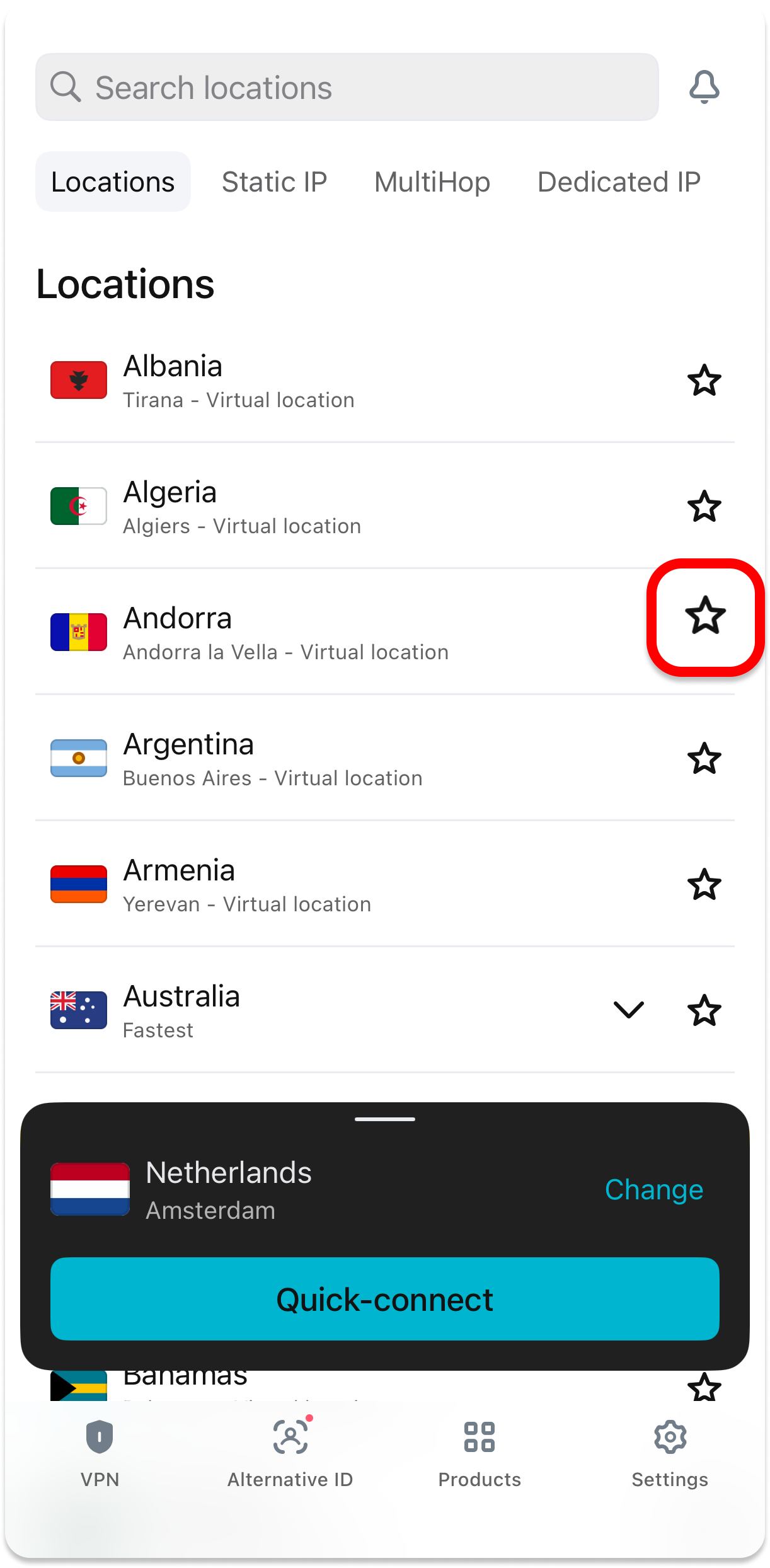 4. Choose between the fastest, the nearest server, or any location of your choice. Your quick-connect location will save automatically: