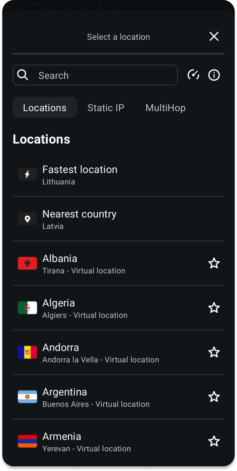 Choose the fastest server or the nearest country, or scroll down and pick a server from the locations list: