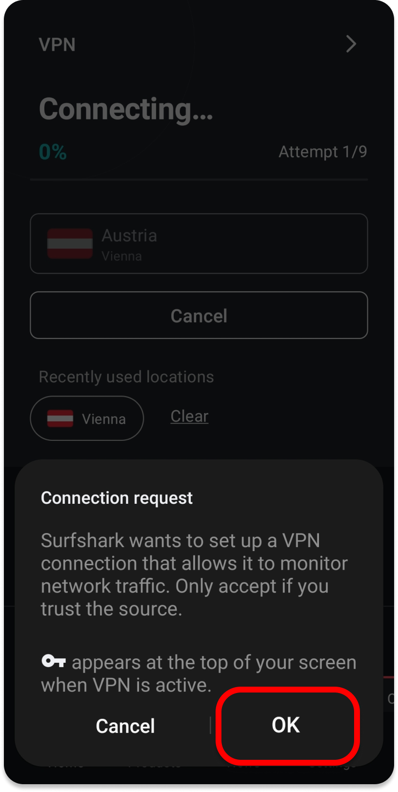 When trying to connect for the first time, you will be asked to allow Surfshark VPN to set up a VPN connection. This is necessary for Surfshark to create and manage the VPN tunnel. Tap ok: