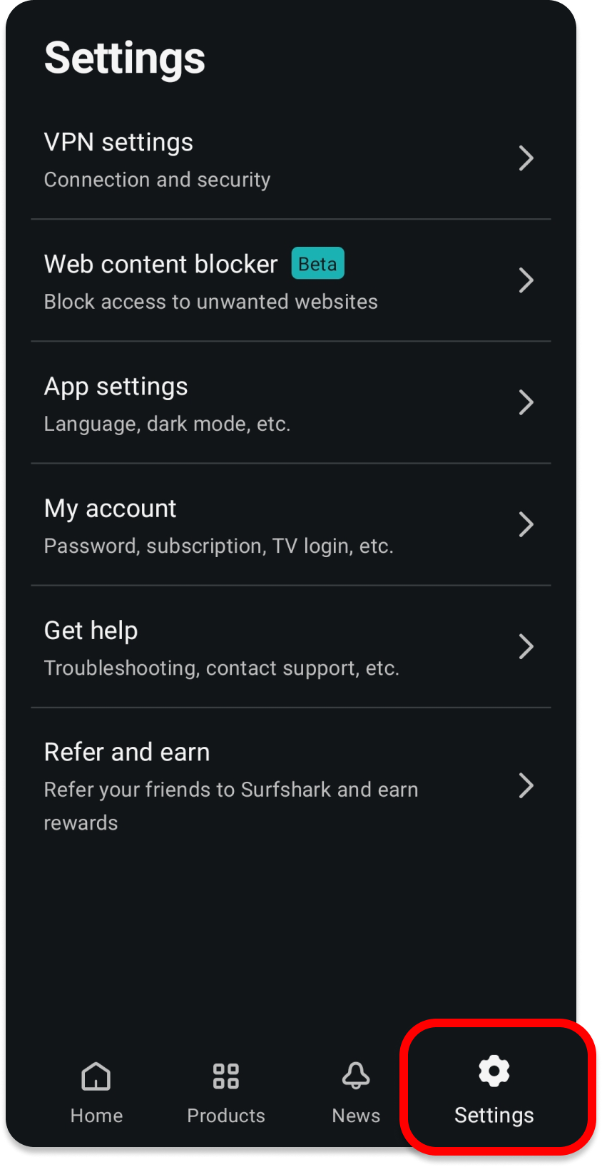 Open the settings page on the Surfshark app. Below we'll cover all the options available here.