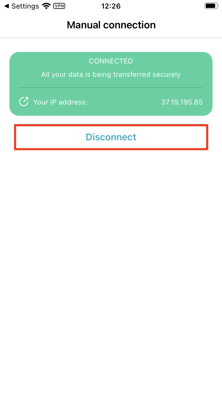 - The next thing you'll see will be the connection status window. If the connection was successful, you should see the connection status in a green bar, your new IP address, and a button to disconnect. To disconnect, tap Disconnect.