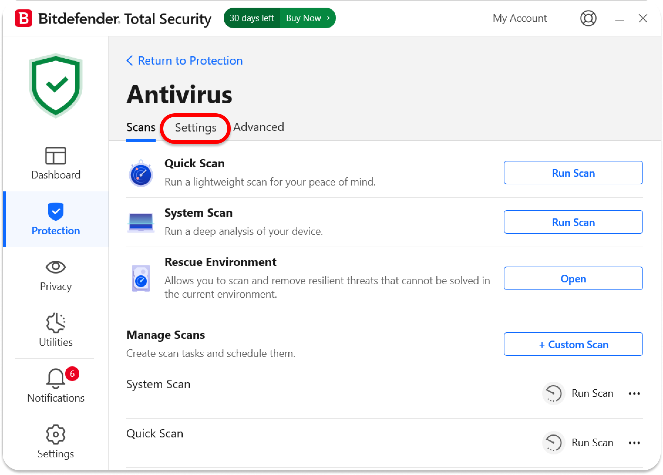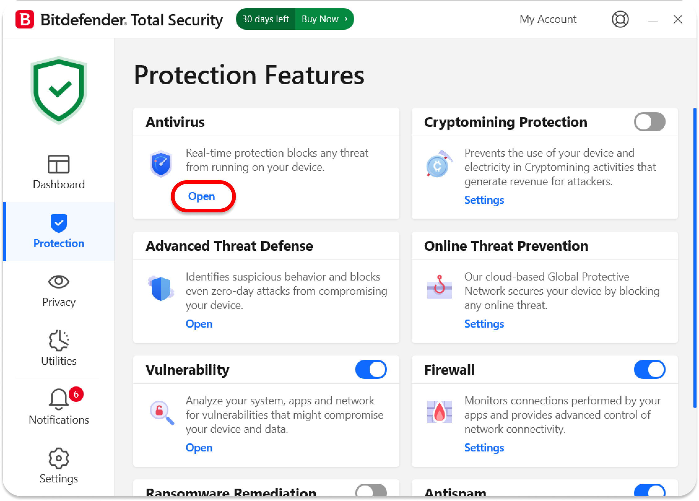 Open the BitDefender application and go to the Protection tab on the left side of the app.