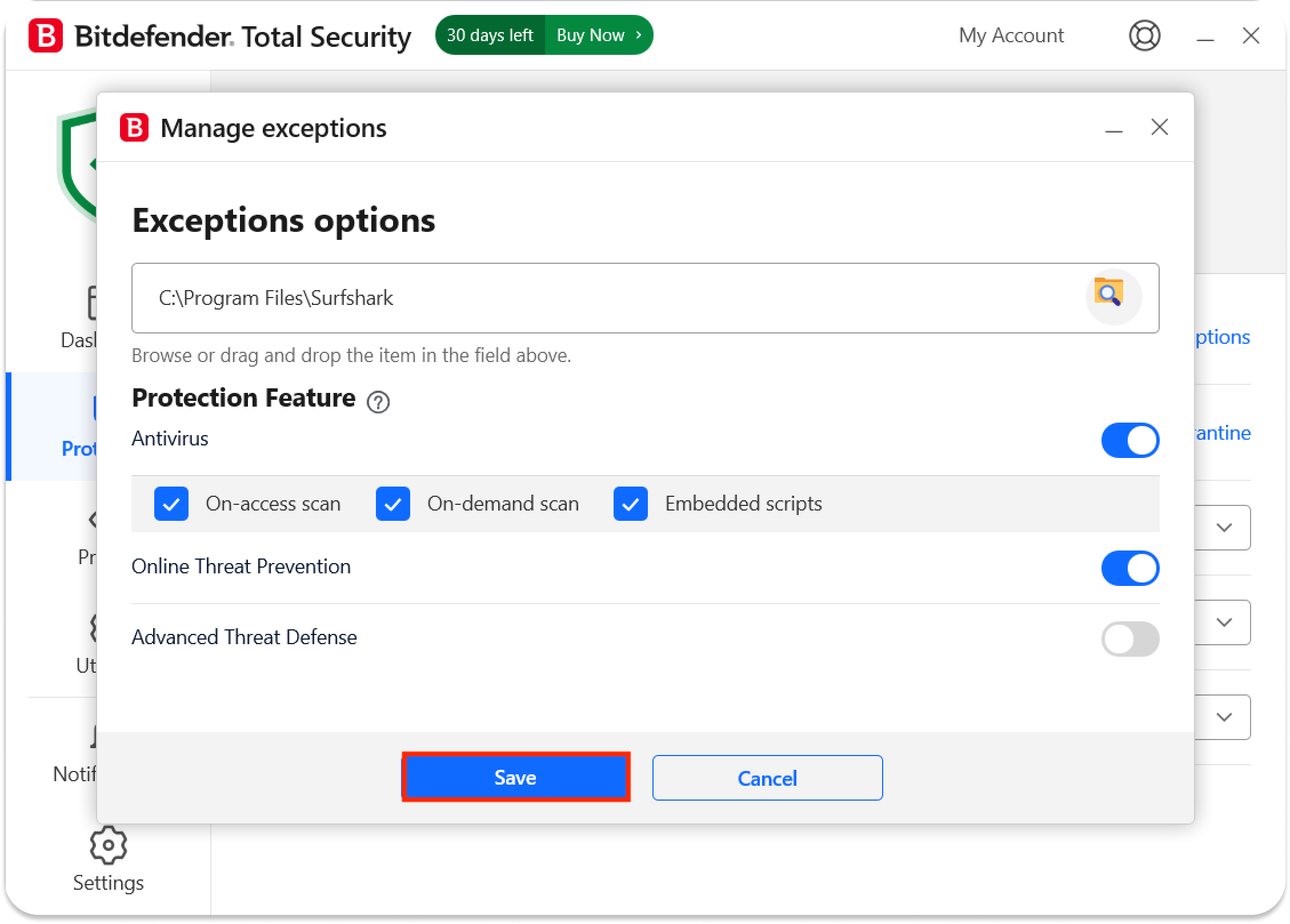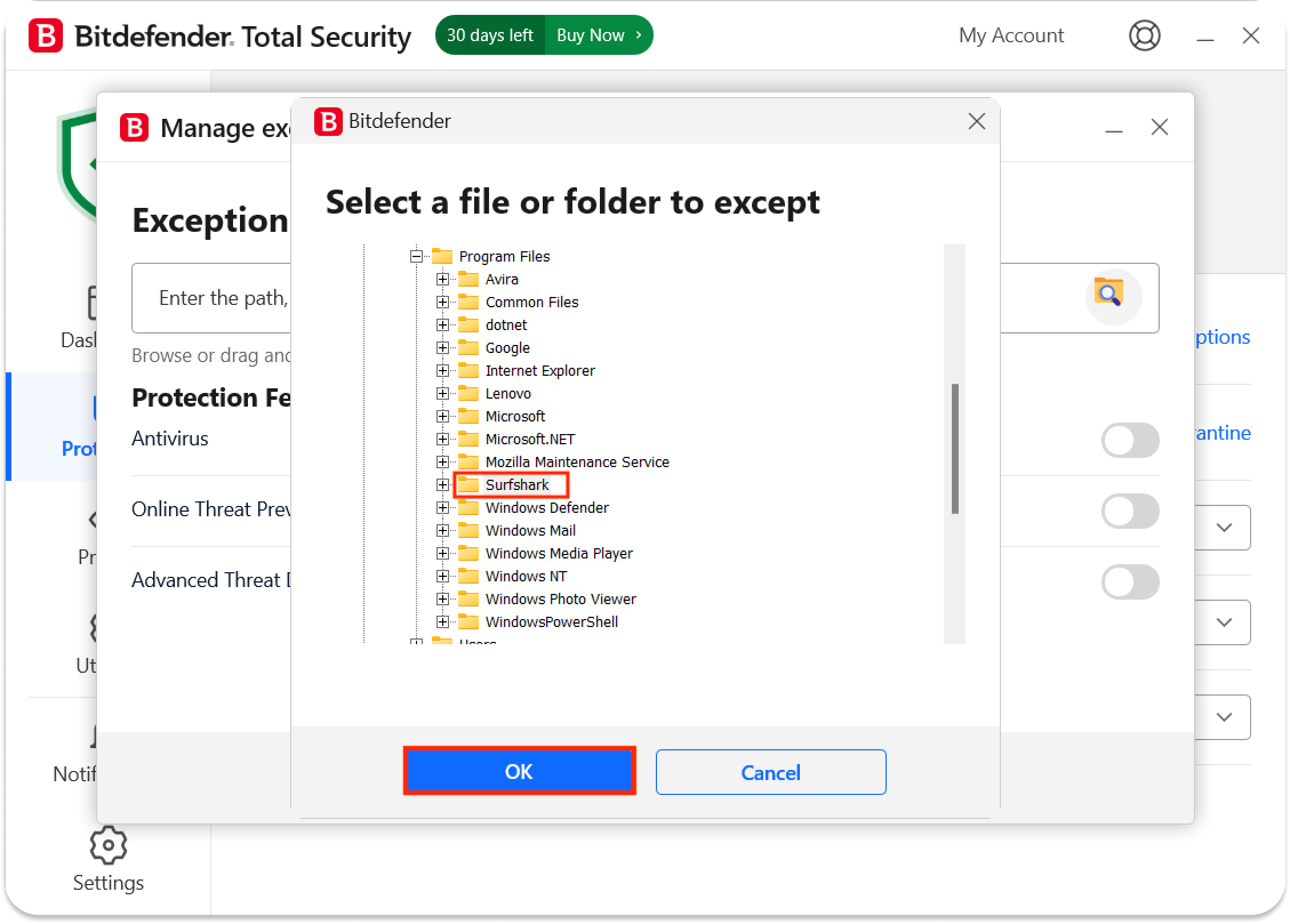 To make an exception for Surfshark in BitDefender antivirus settings, follow these steps: