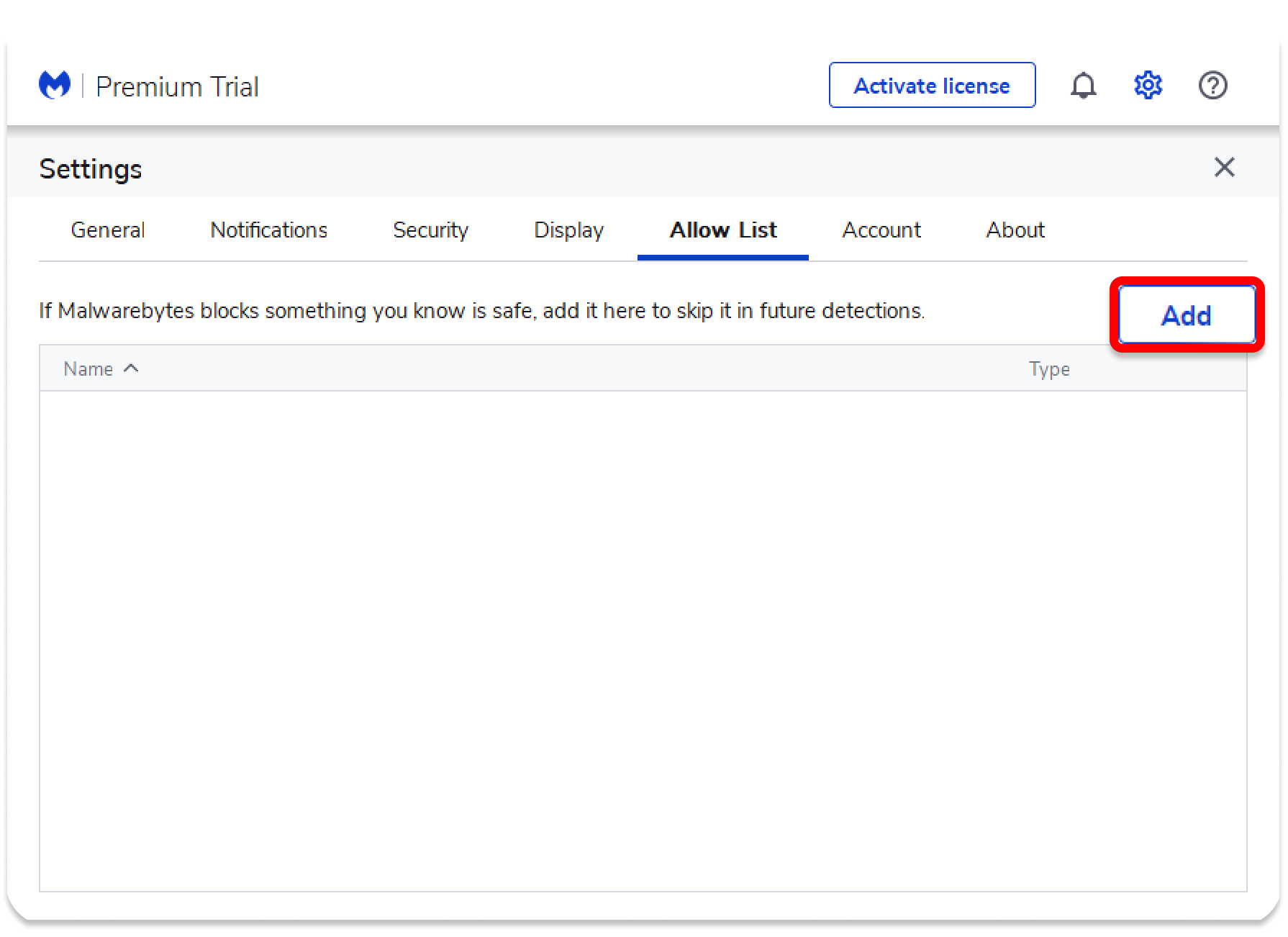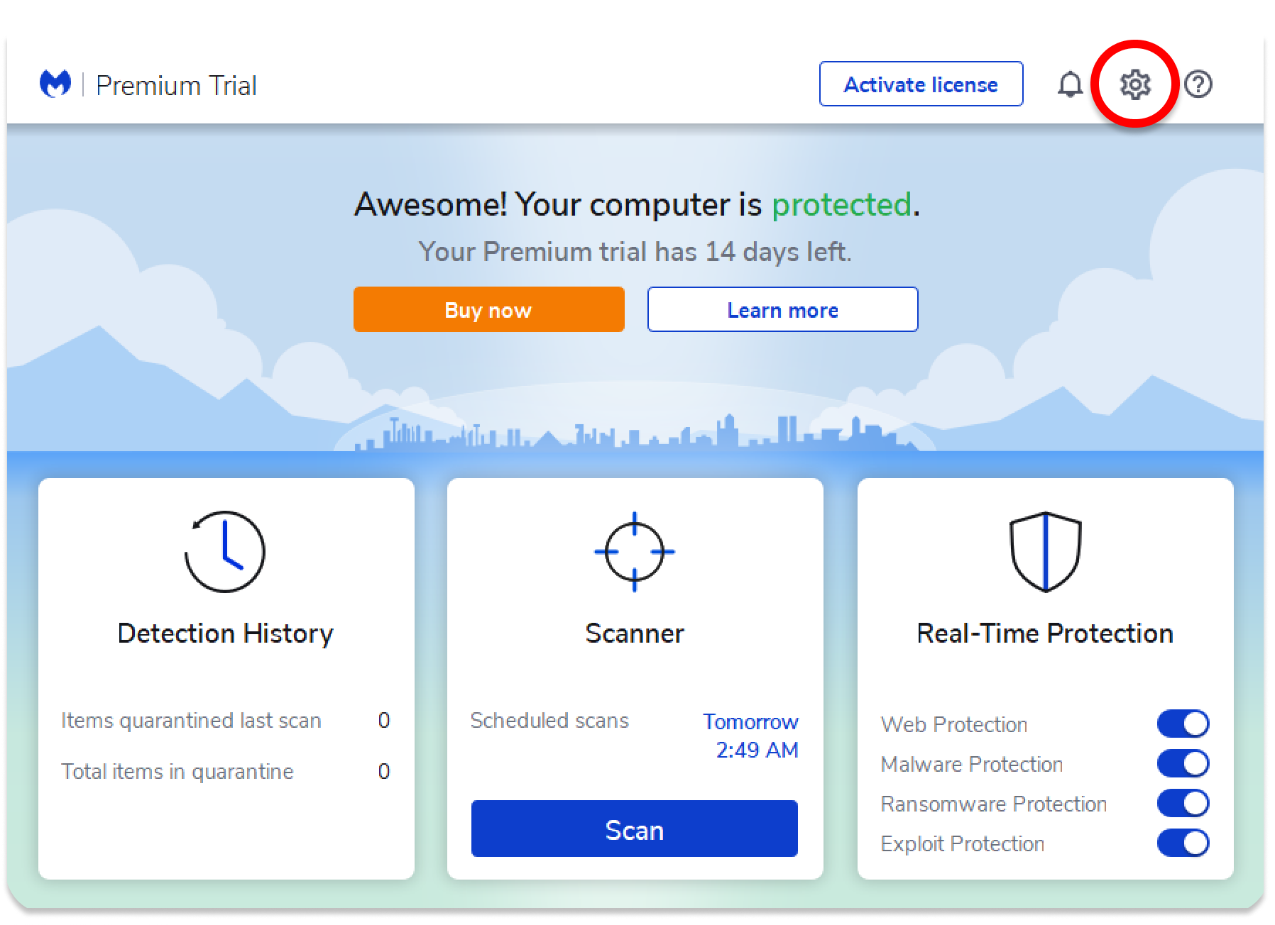 Launch the Malwarebytes app and click on the cogwheel at the top-right corner.