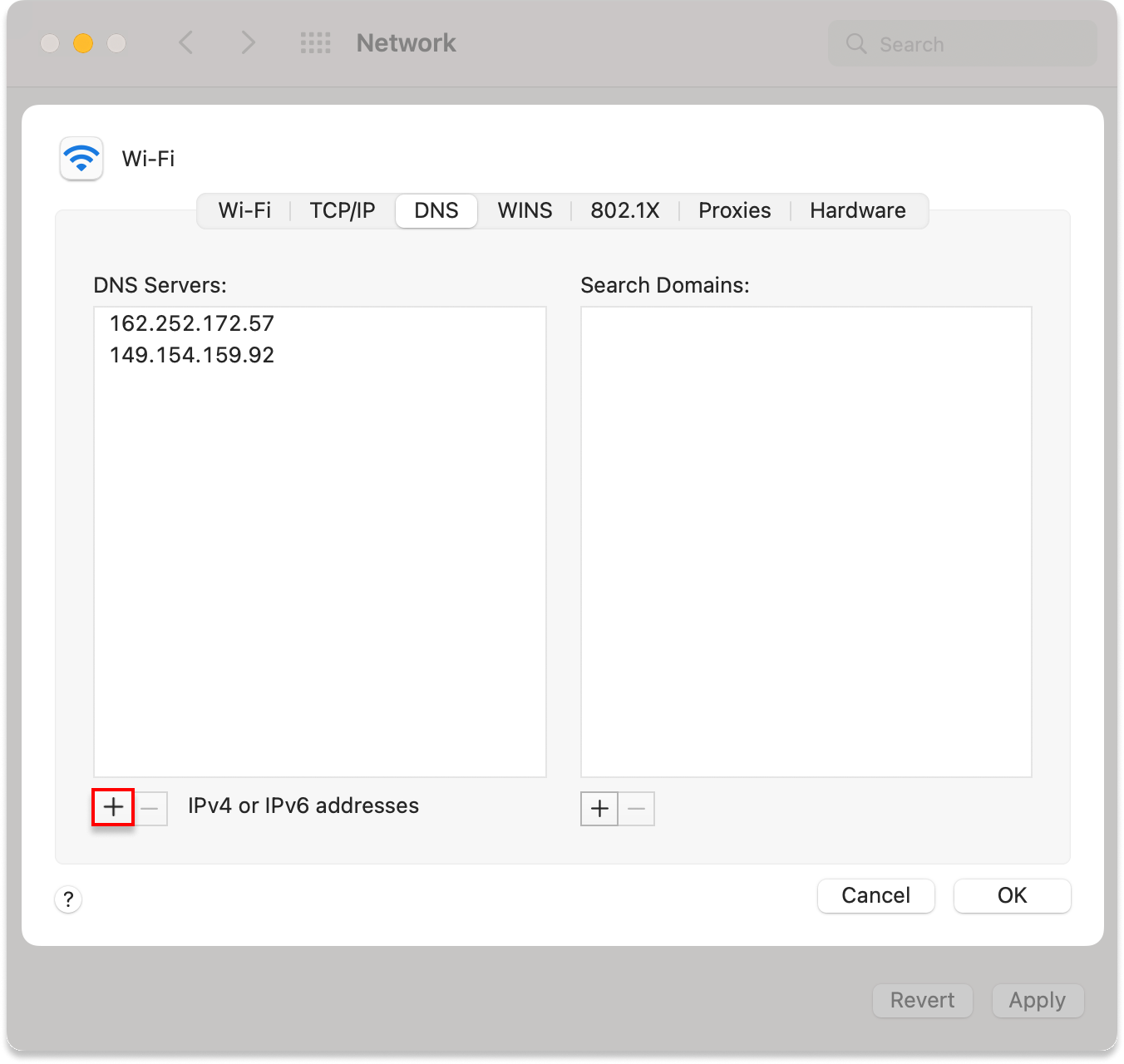 In the new window, select the DNS section. After that, you will be able to add ( + ) or remove ( - ) DNS entries. Click on + to add your DNS entries.