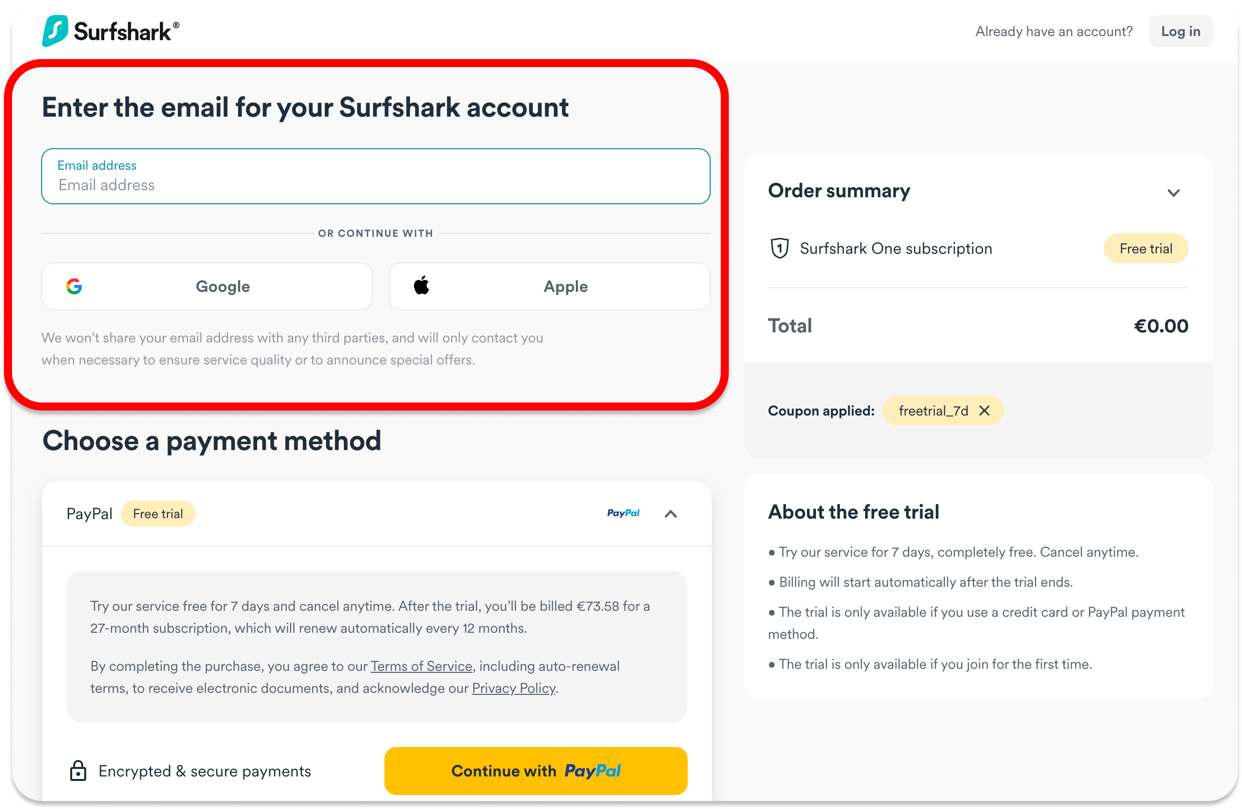 Enter the email address for your Surfshark account, continue with Google/Apple, or log in to an already existing account, and, most importantly, choose PayPal or Credit card as the payment method.