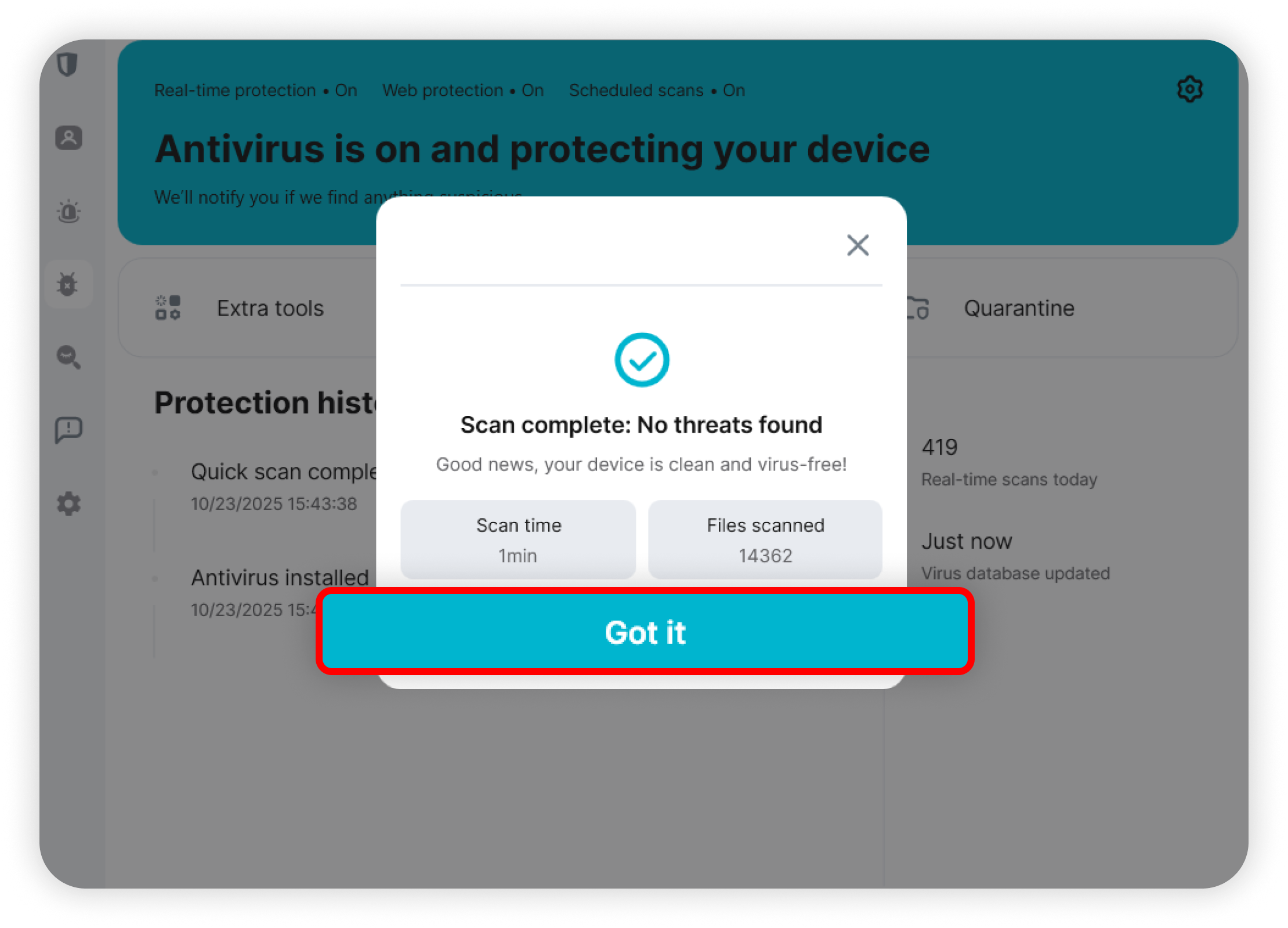 Once the initial scan is complete, you will see the number of files scanned and the overall duration of the scan. You will also know if the Surfshark Antivirus finds any threats on your device.