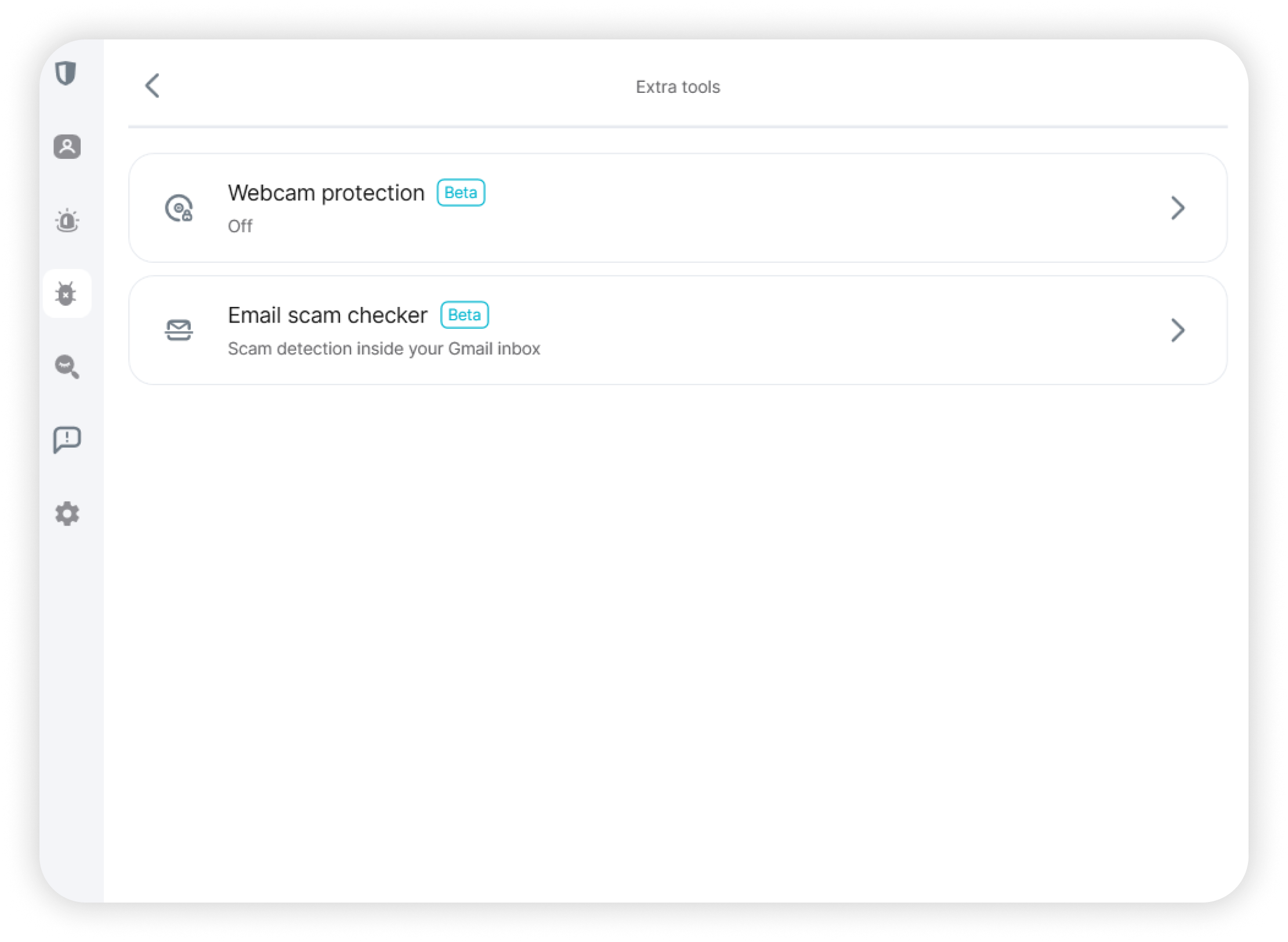 When you click the "Extra tools" button, you can configure the Surfshark Webcam protection and the Email scam checker.