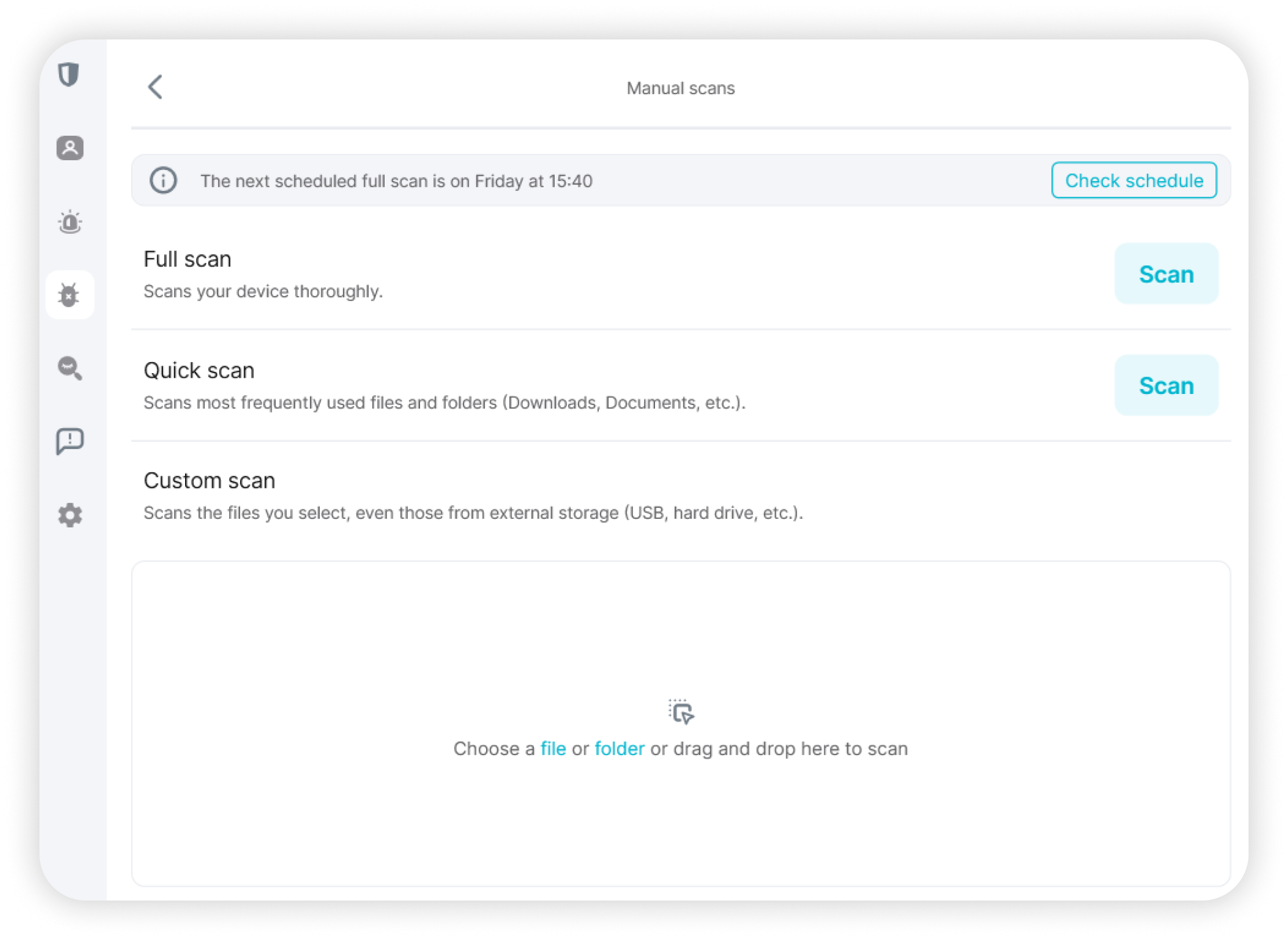 - Scheduled scans – schedule an automatic Full or Quick scan for certain days at a specific time.