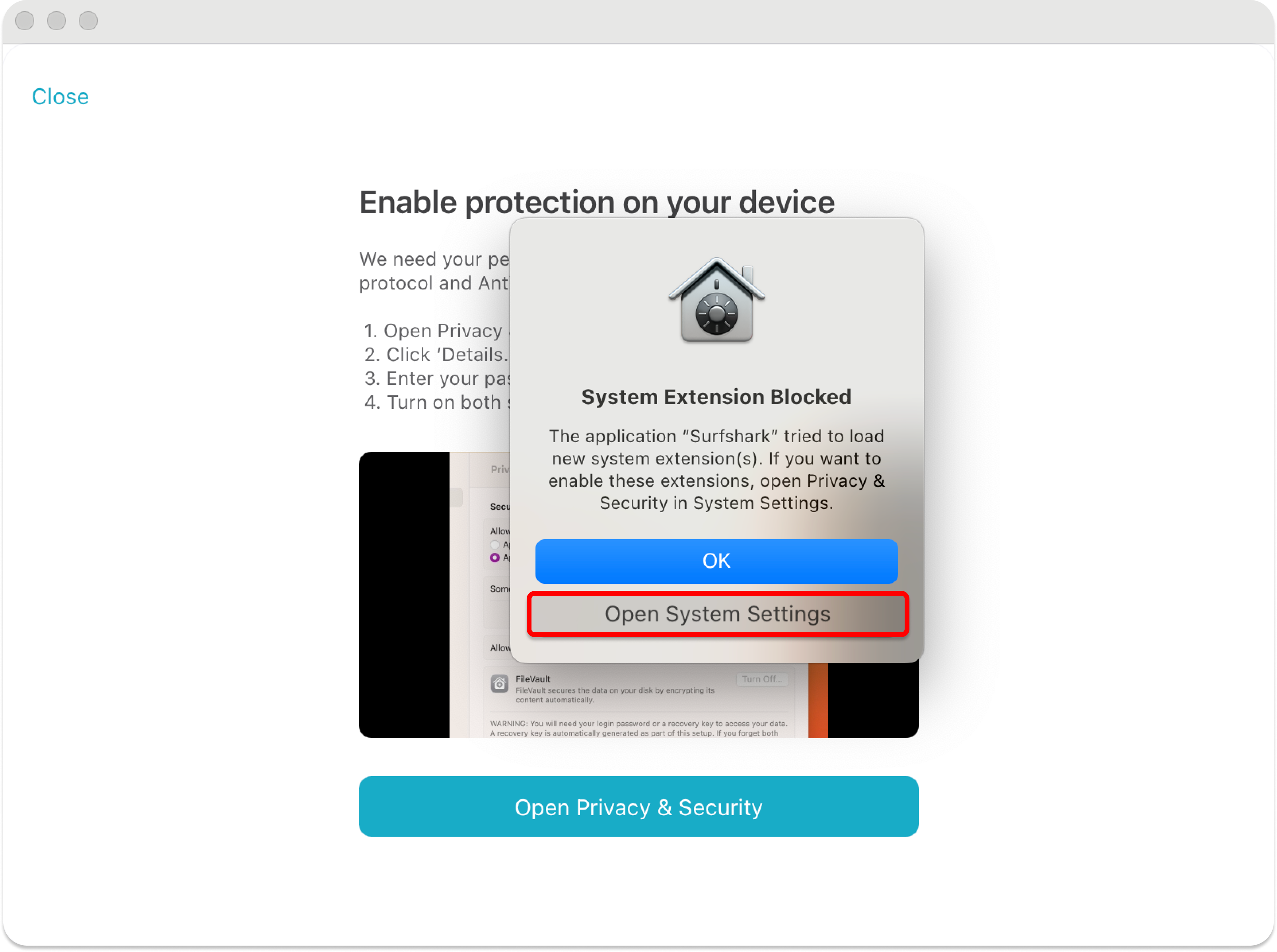 When you attempt to connect for the first time, a system pop‑up will appear. Click Open System Settings: