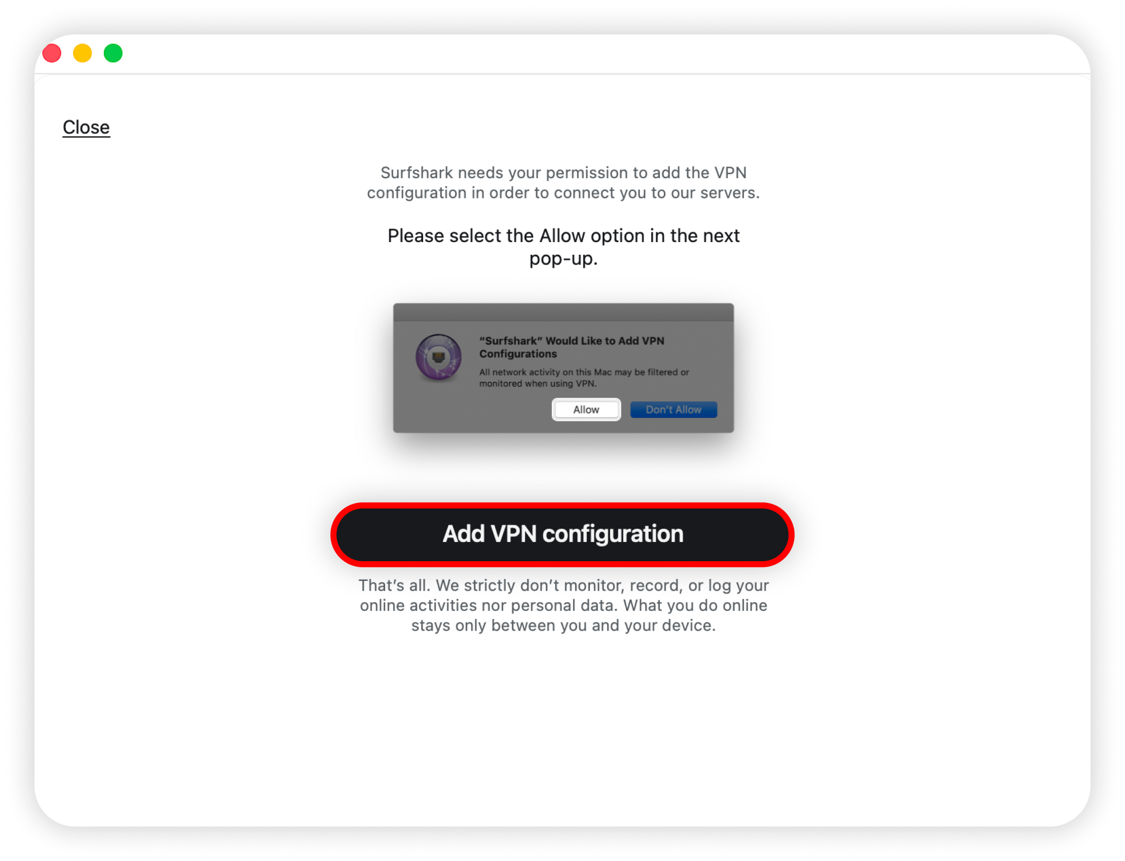 When prompted, approve adding Surfshark to your VPN configurations by clicking Allow: