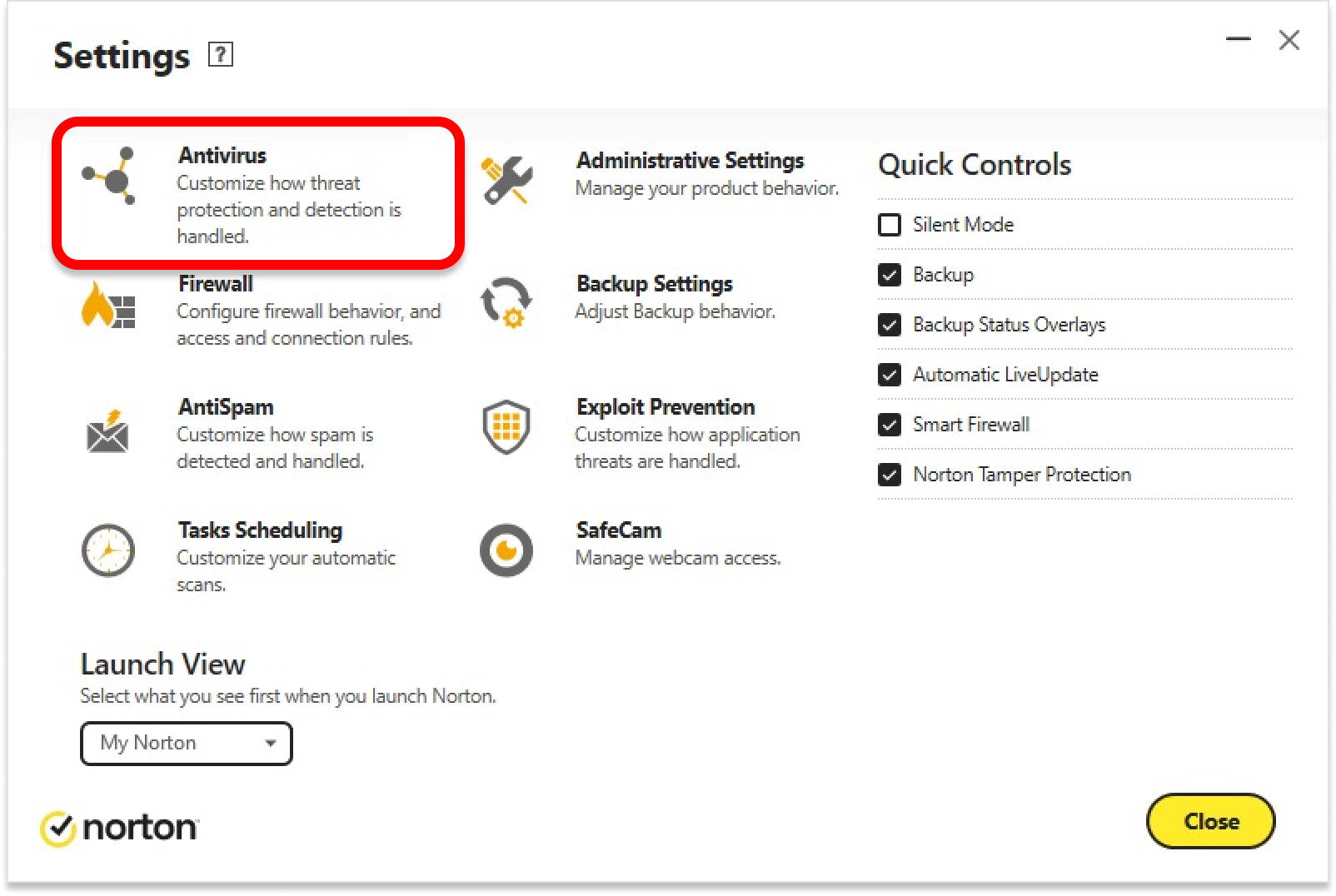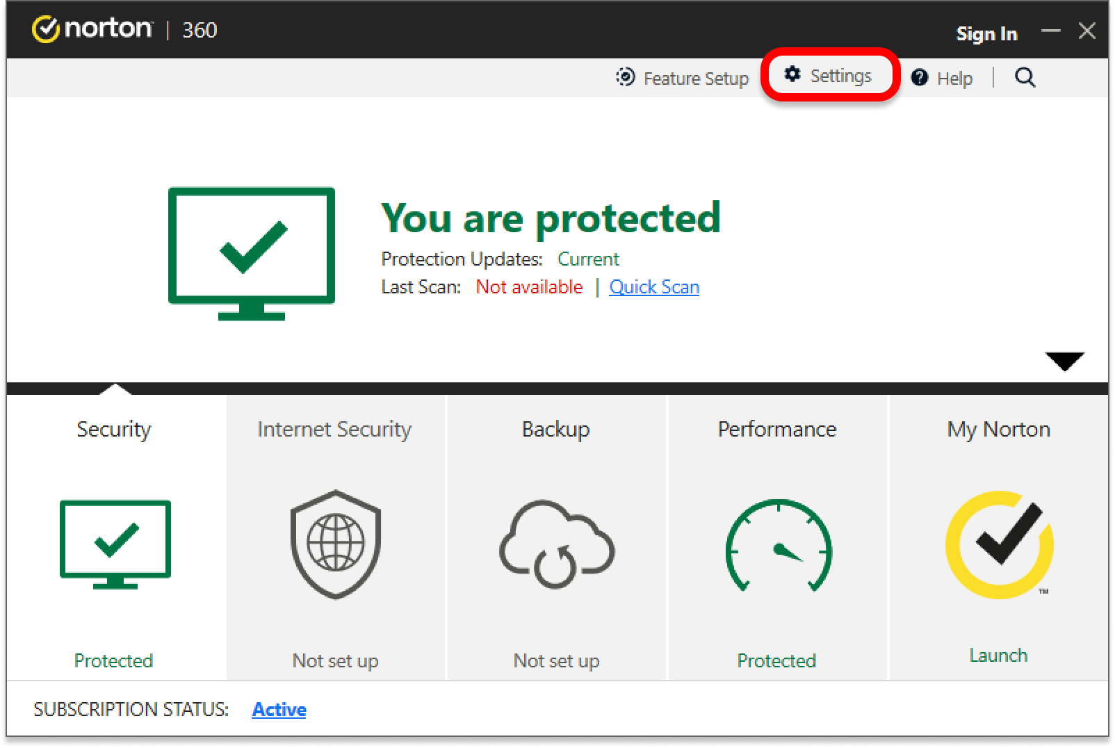 Launch the Norton application and click on the Settings button at the top right of the window.