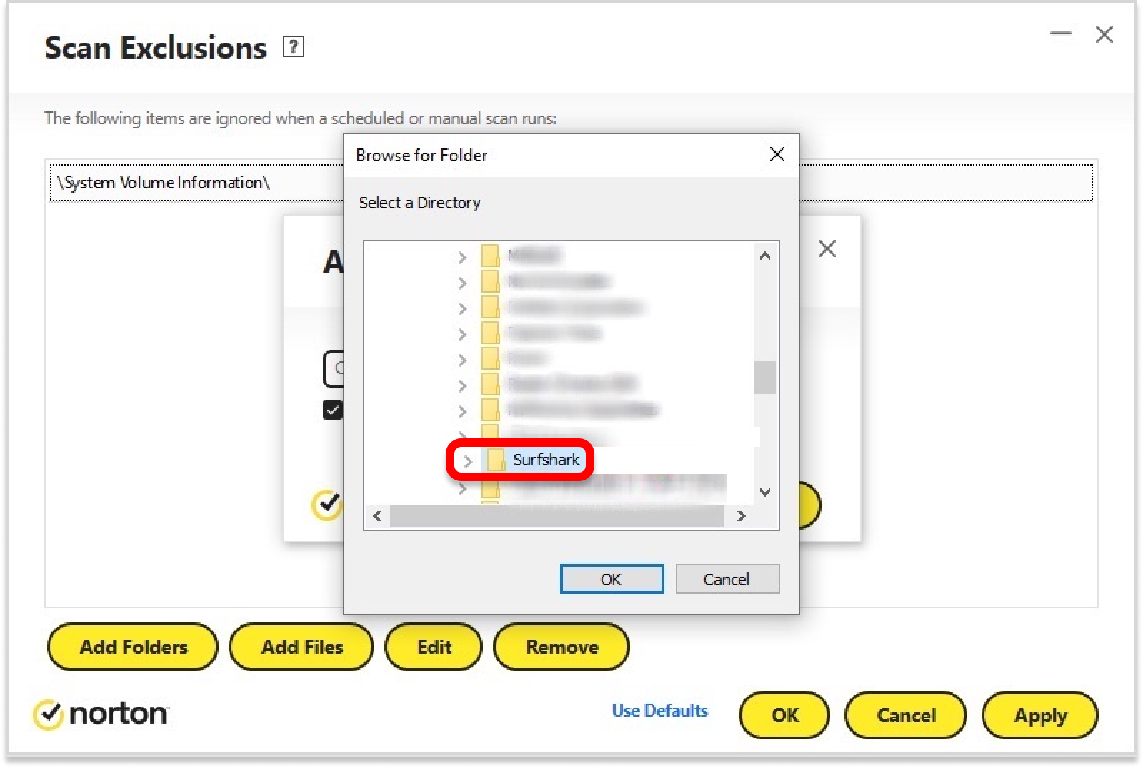 Now, the pathway to Surfshark's folder should be visible in the Scan Exclusions window. All that is left to do is to press Apply and OK to save the exclusion you have just added.