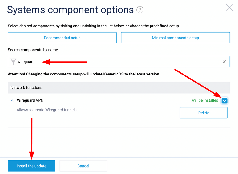 Type in WireGuard in the search bar, check the box next to WireGuard VPN, and click Install the update button.