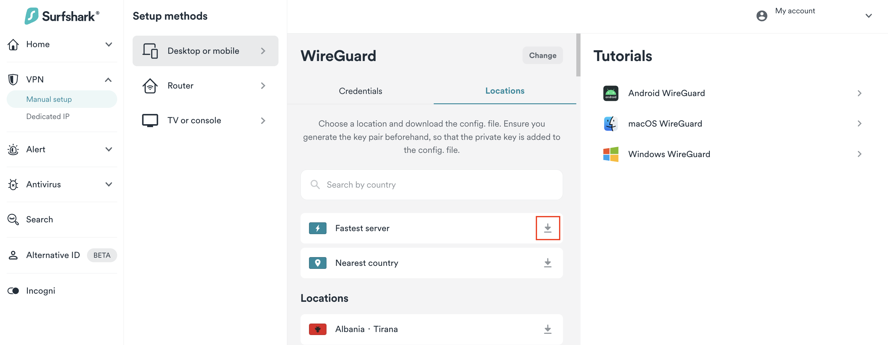 Once you have your key pair, you should see a Choose a location button. Click on it. Here, you'll find the list of available locations to connect to. Select one and hit the download button.