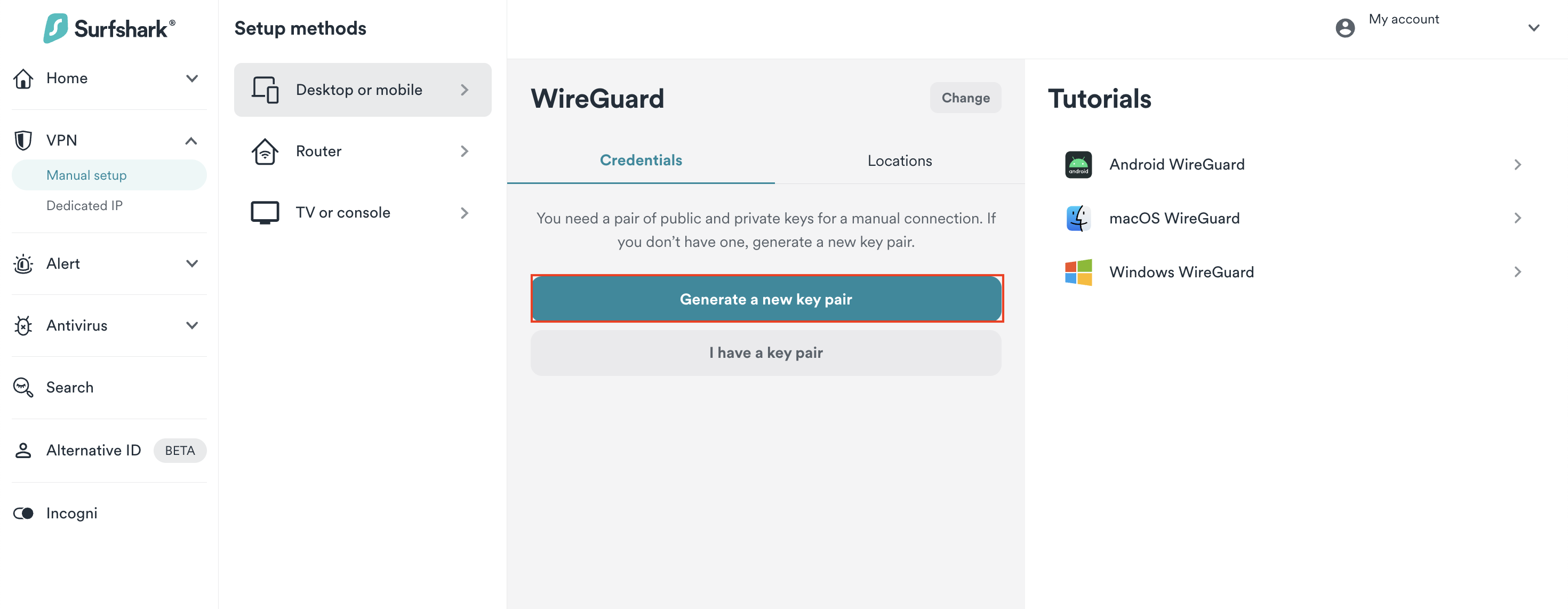 - Go to Surfshark's login page and log in. Then, visit VPN > Manual setup. Choose the Desktop or mobile option and click on WireGuard.