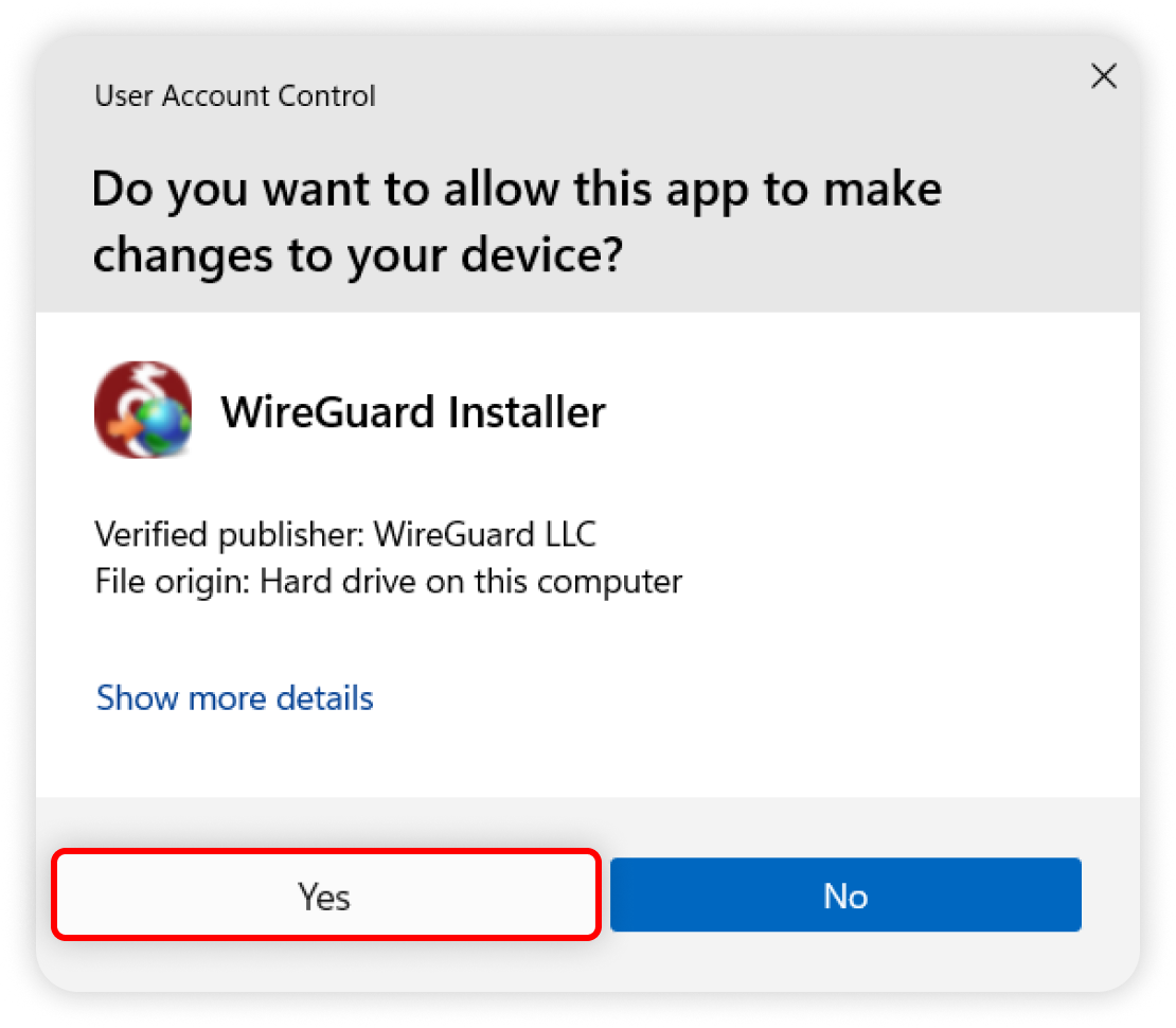 - Once the download is complete, launch the WireGuard installation file. Once launched, you will receive a pop-up. Click Yes