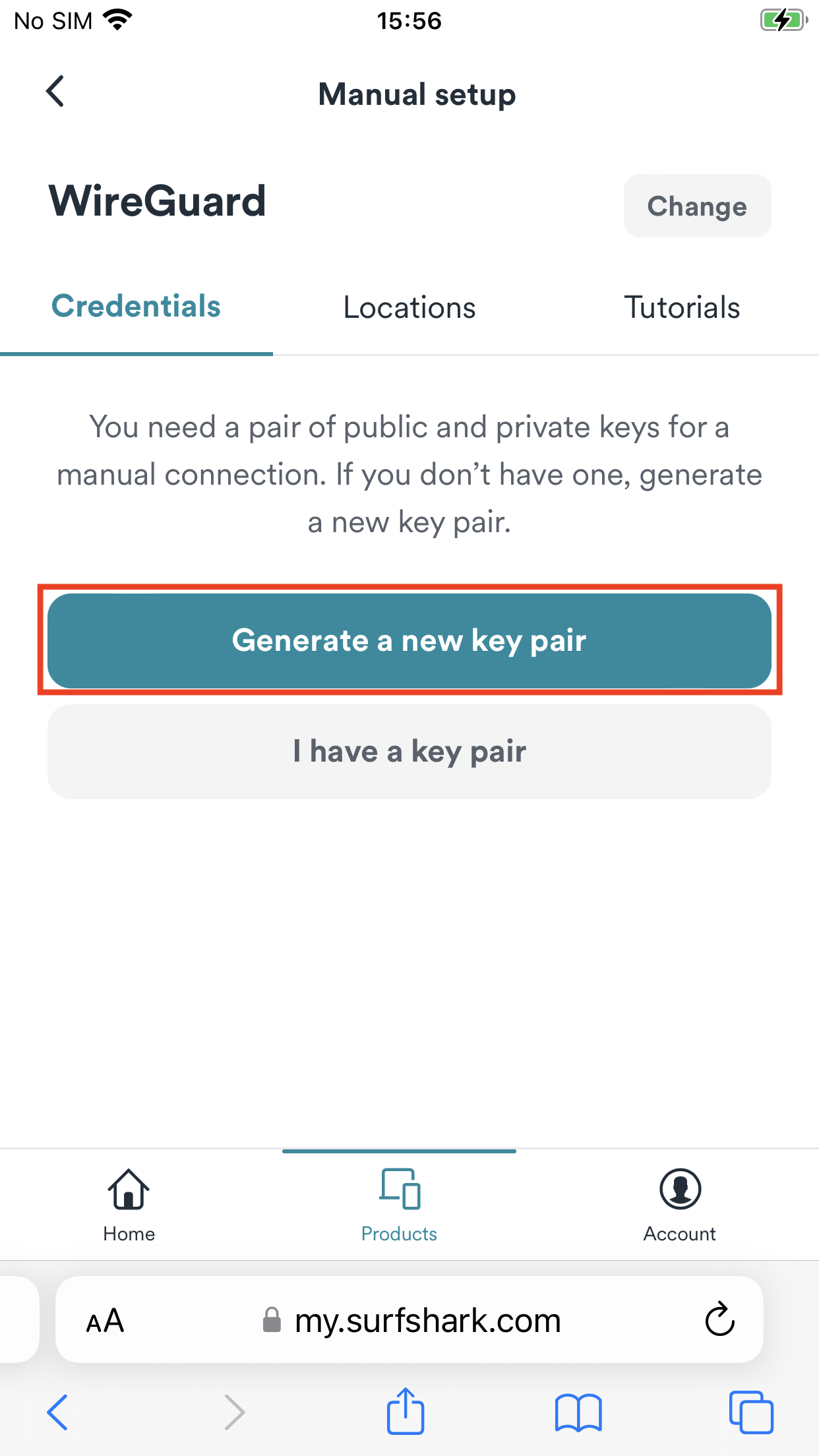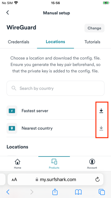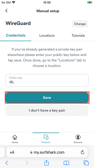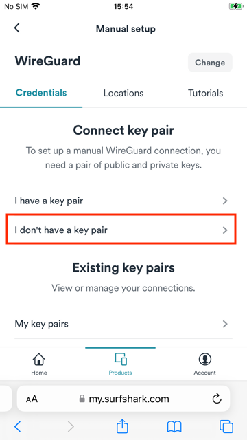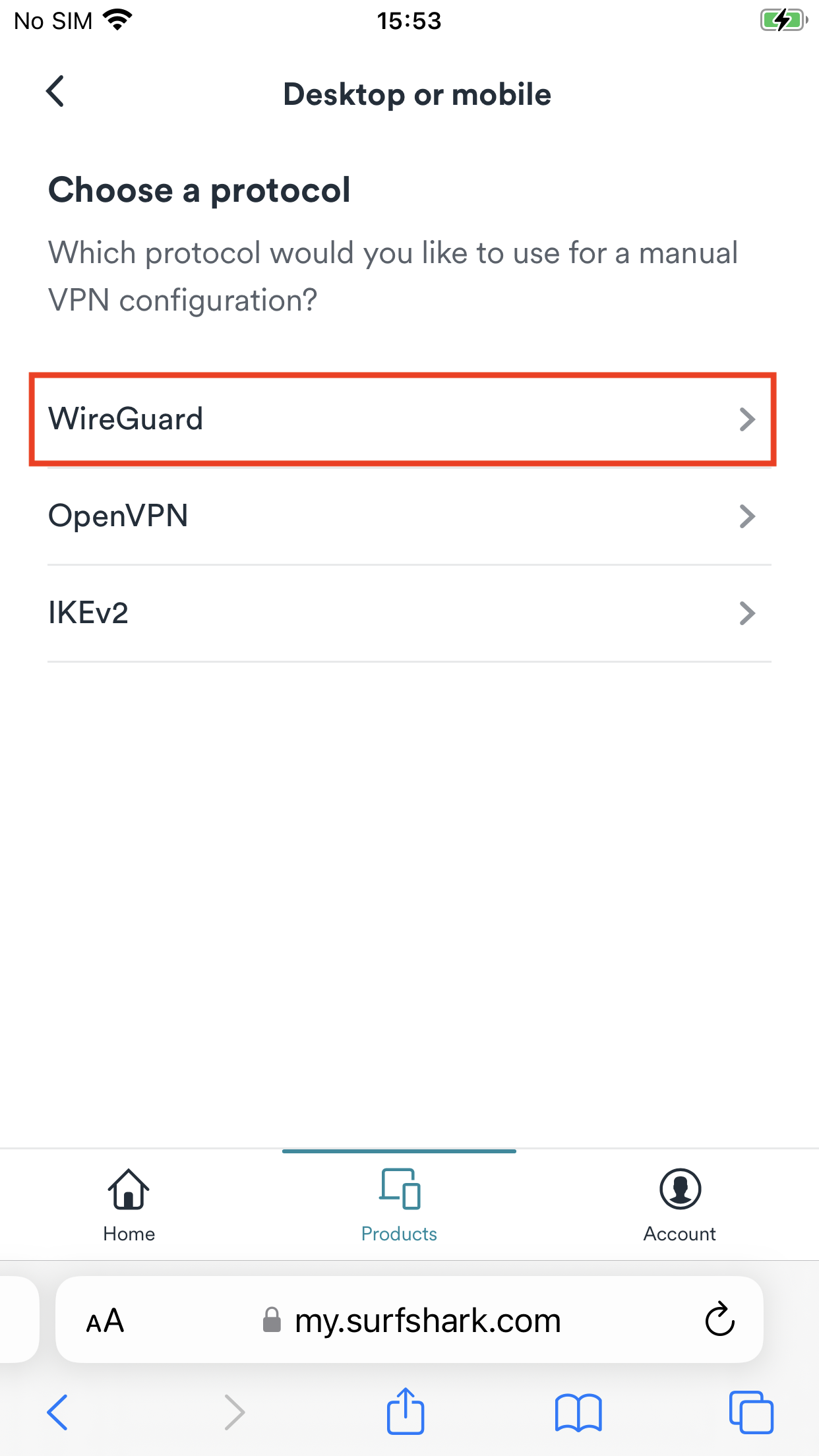 - Open Safari or any browser on your iOS device, and go to Surfshark's login page. Tap Products > VPN > Manual setup > Desktop or mobile > WireGuard