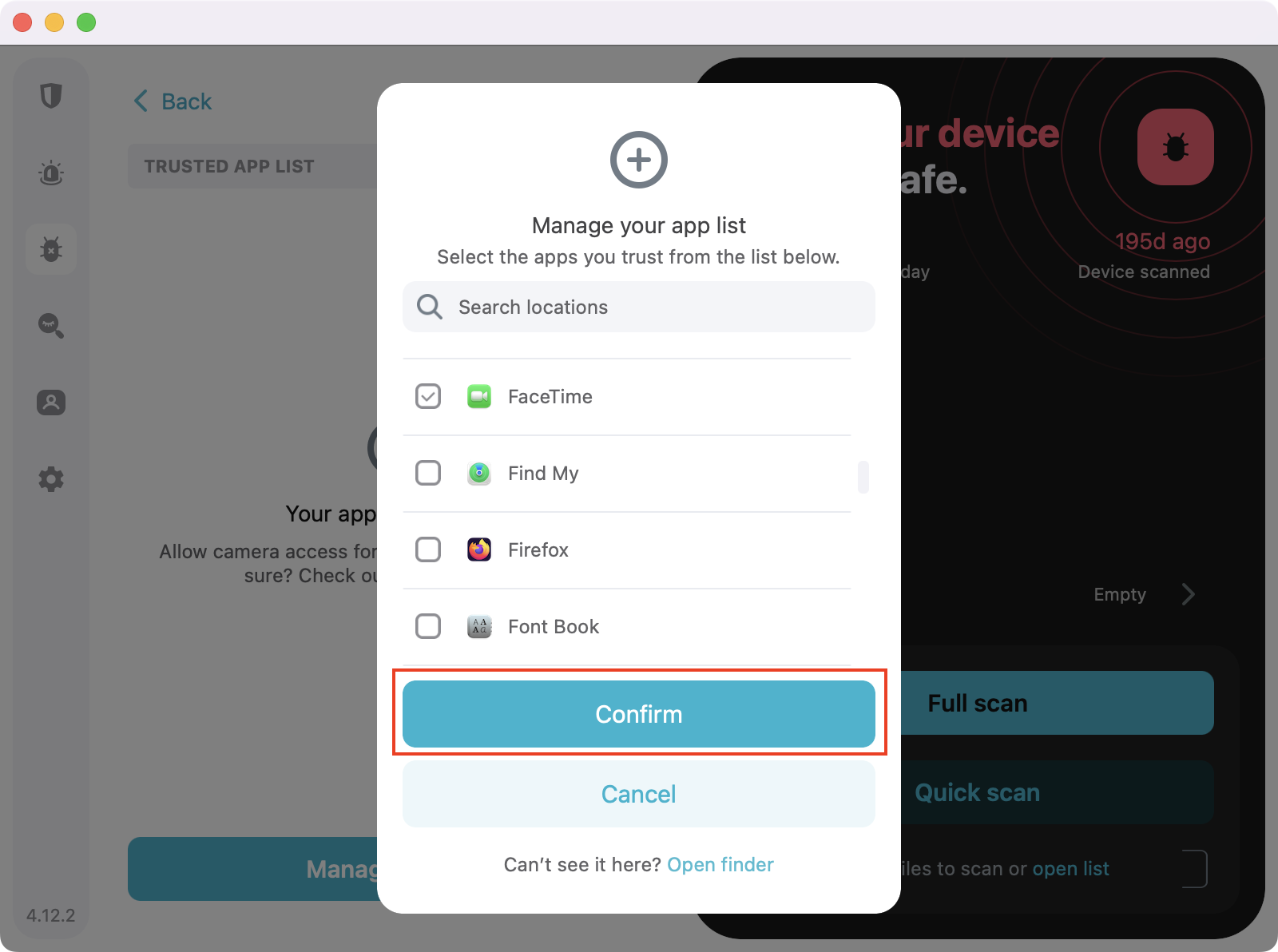 3. Once you select your apps, simply hit Confirm. In our case, we added the FaceTime app to be able to use the webcam.